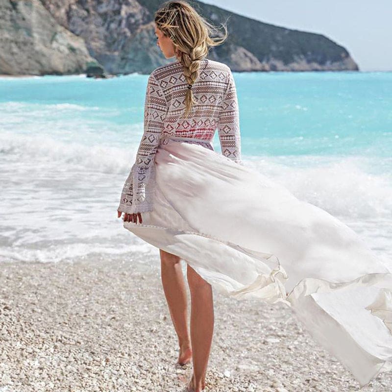 Kimono blanc en tissu léger à manches longues. Fermé à l’avant par une ceinture à nouer. Le haut de ce kimono est ajouré. Vous apprécierez son élégance lors de balades romantiques !