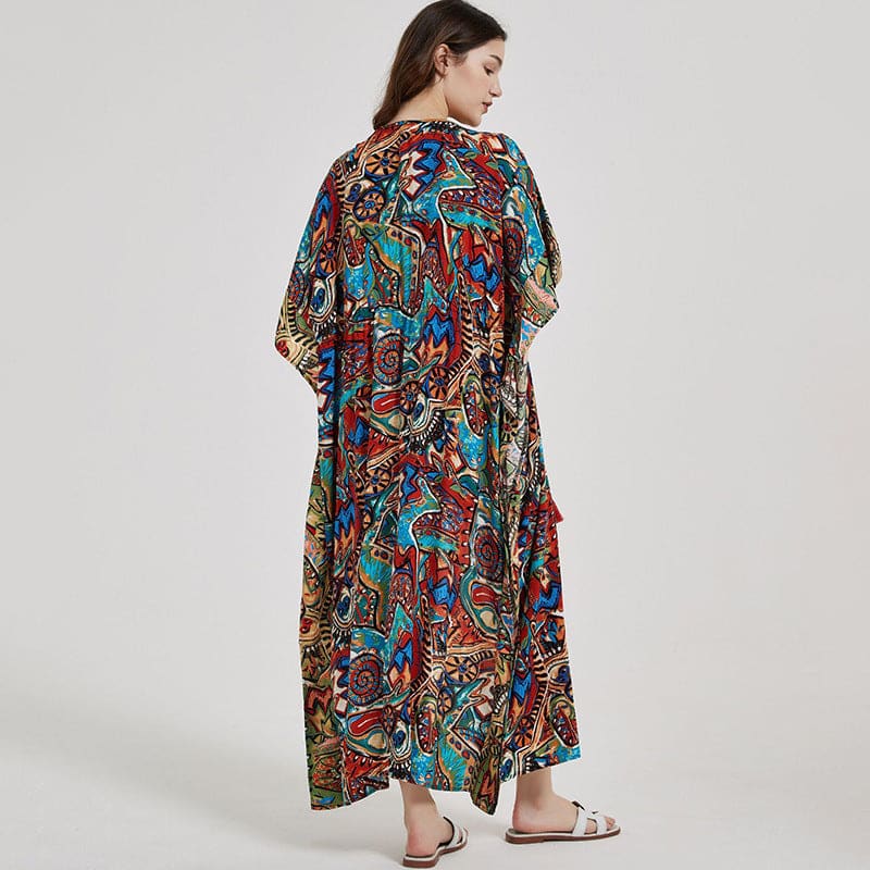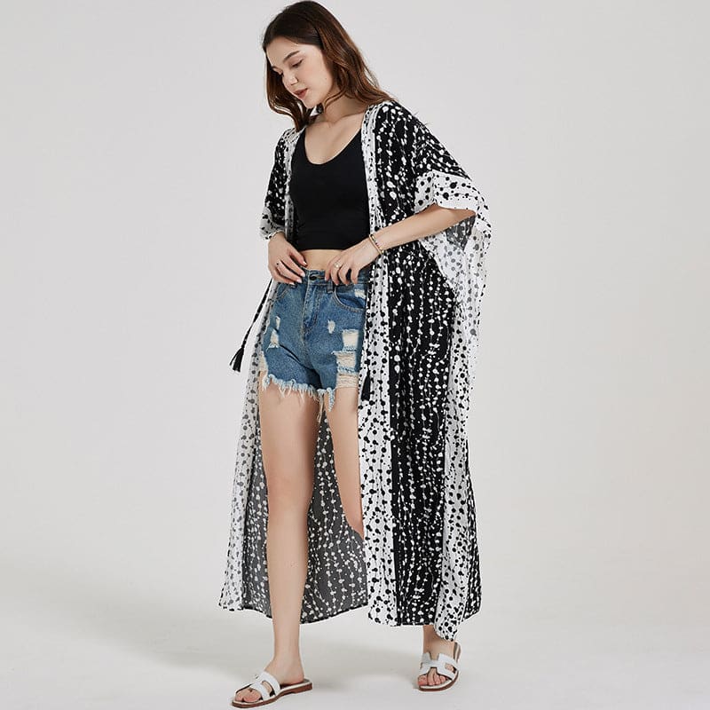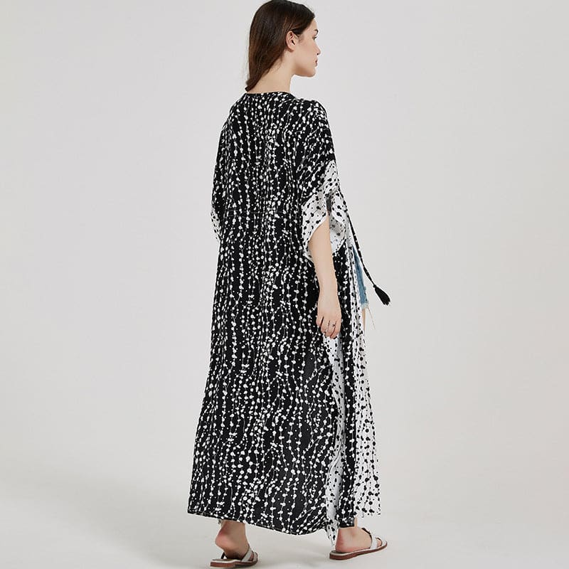 Long kimono réalisé dans un tissu très coloré et un autre plus neutre blanc et noir. Avec manches courtes et un petit cordon à nouer à la taille. Parfait pour passer une soirée tranquille. Type d’article : kimono Épaisseur : fin Matériel : coton / polyester Longueur : longue Coupé : ample Style : chic […]