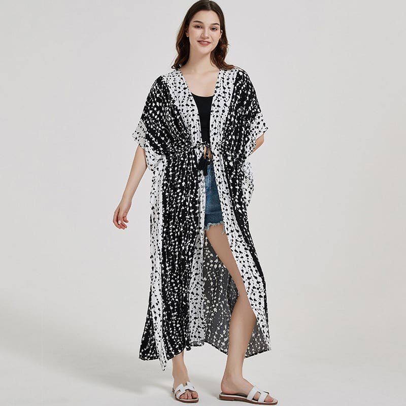 Long kimono réalisé dans un tissu très coloré et un autre plus neutre blanc et noir. Avec manches courtes et un petit cordon à nouer à la taille. Parfait pour passer une soirée tranquille.