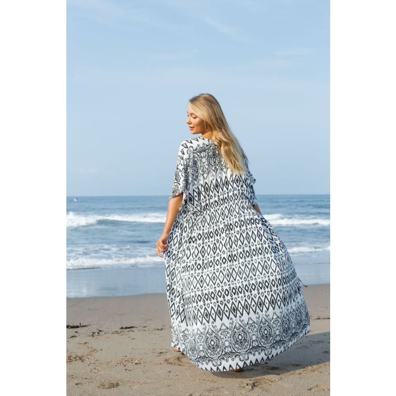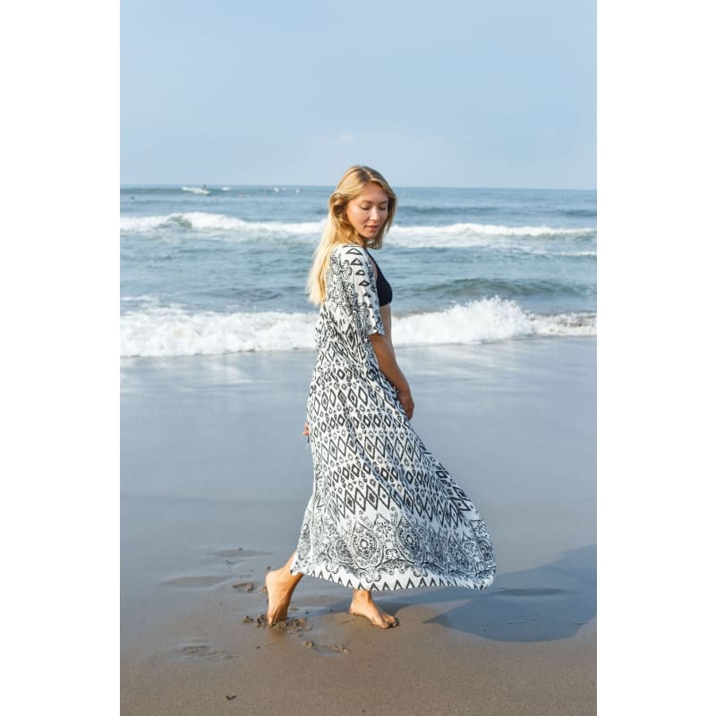 Tissu avec formes géométriques pour la confection de ce kimono long. De belles manches amples et courtes et un petit cordon pour nouer à la taille. Vous serez ravie de l’emporter pour vos vacances à la plage.
