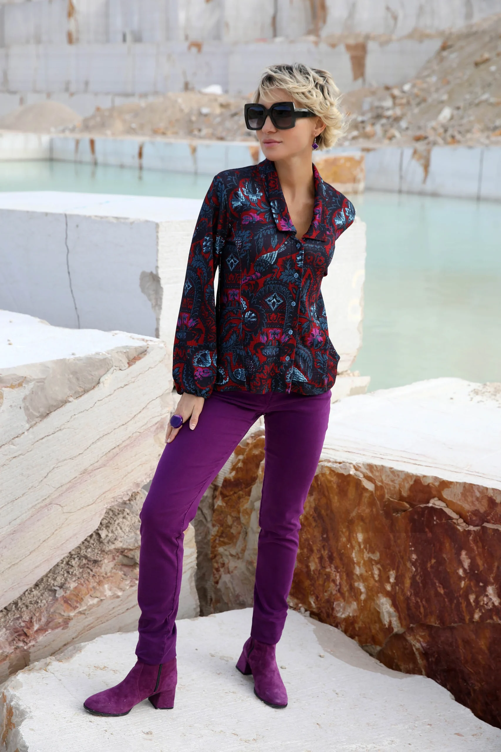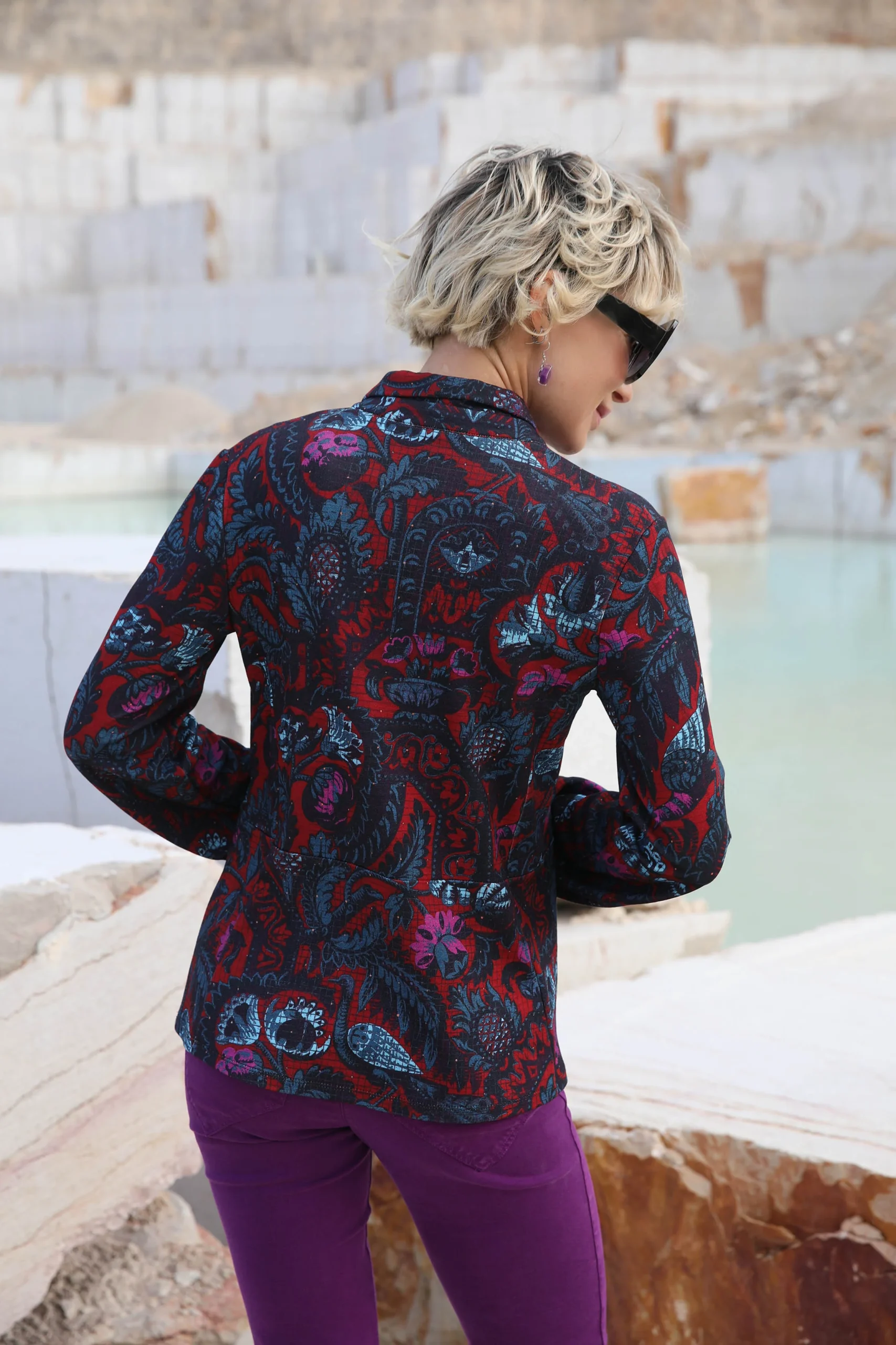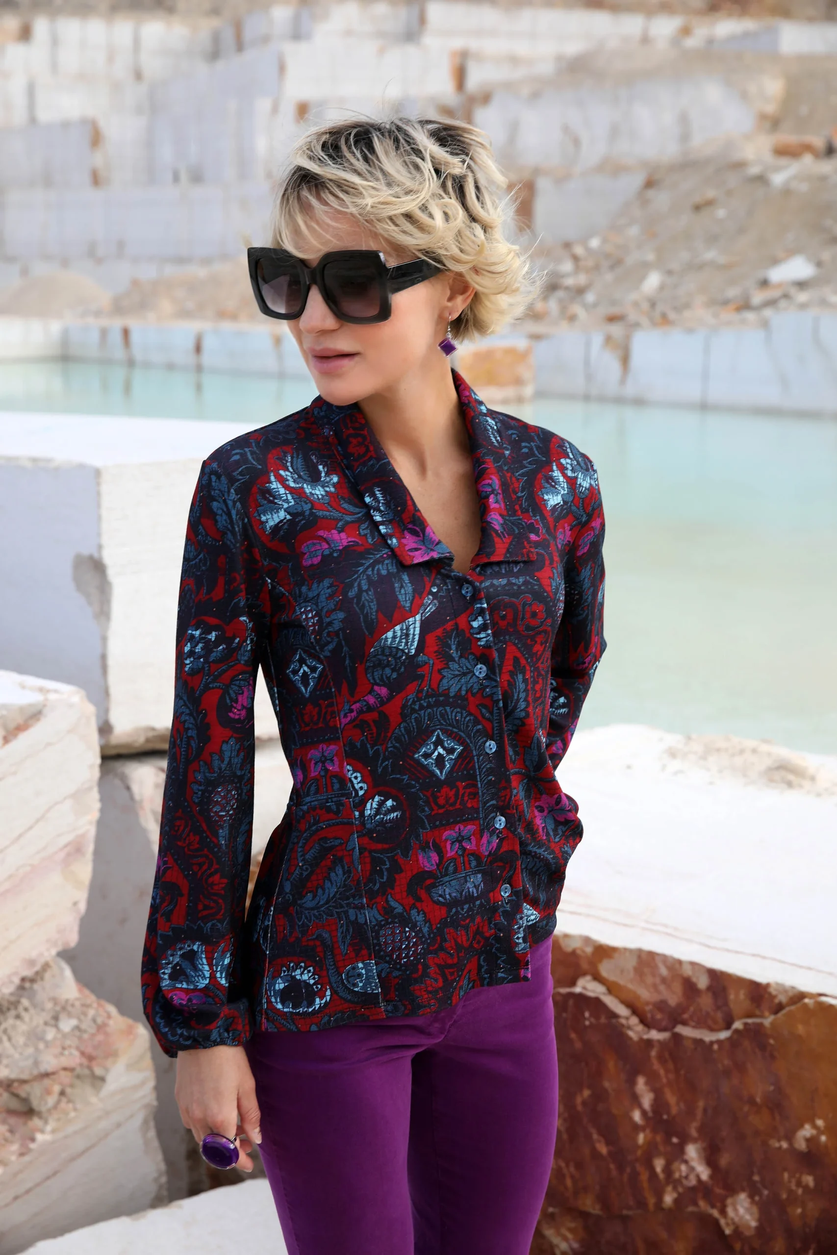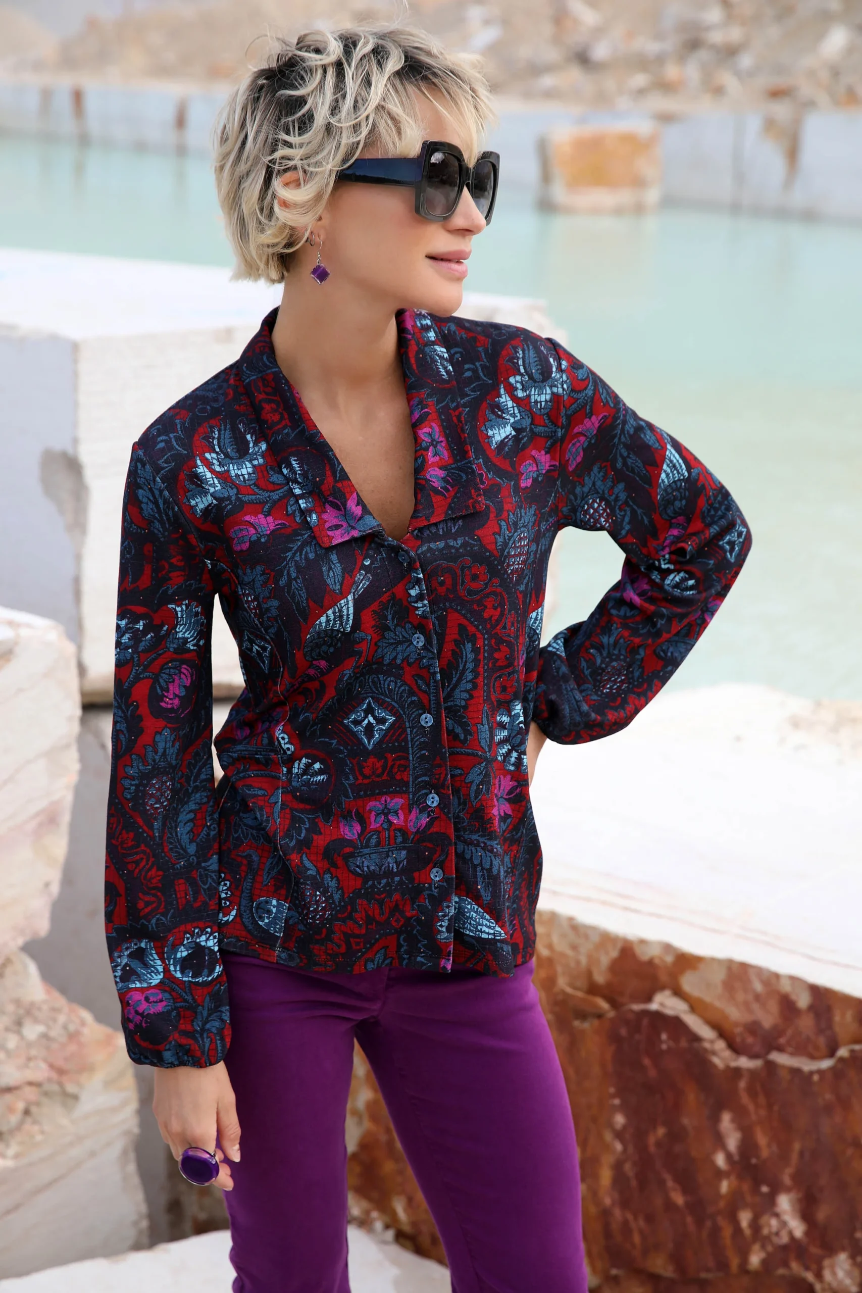 Coupe féminine ajustée au buste, pinces devant et dos Maille épaisse type Milano douce et fluide Imprimé cassis et bleu assorti aux permanents Composition : 93% viscose, 6% polyamide, 1% élasthanne