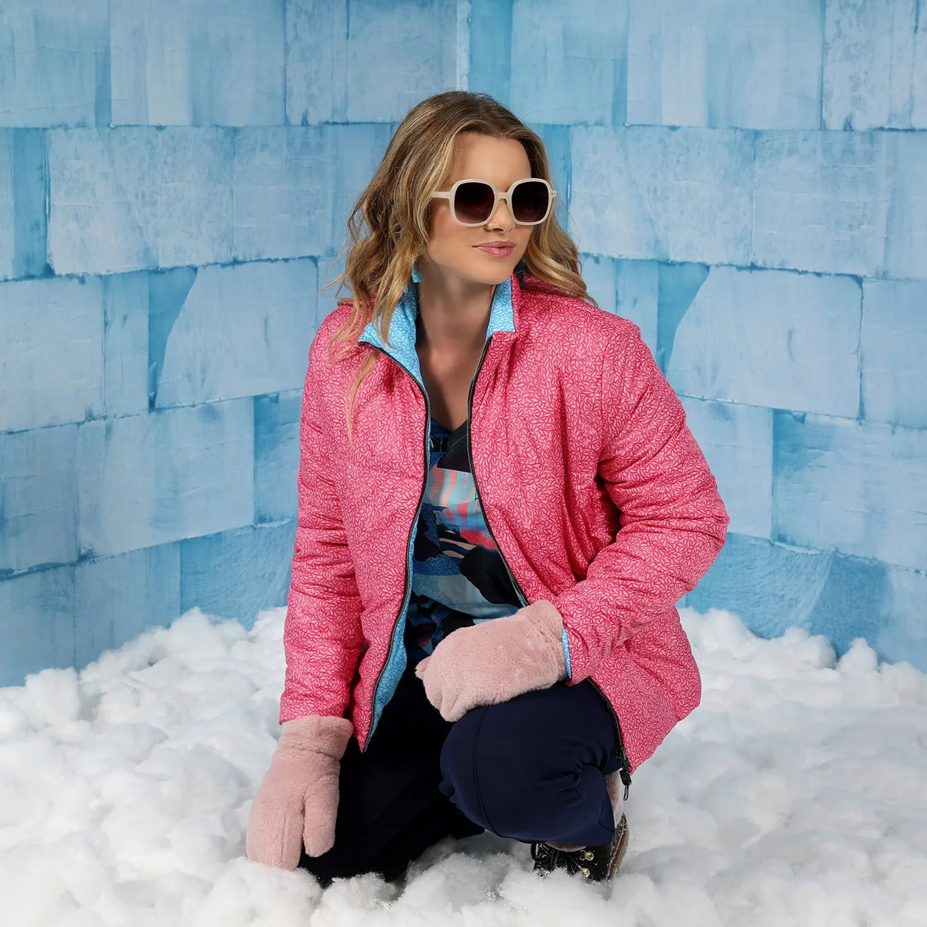 - Coupe droite esprit blouson, deux faces bleu et rose
