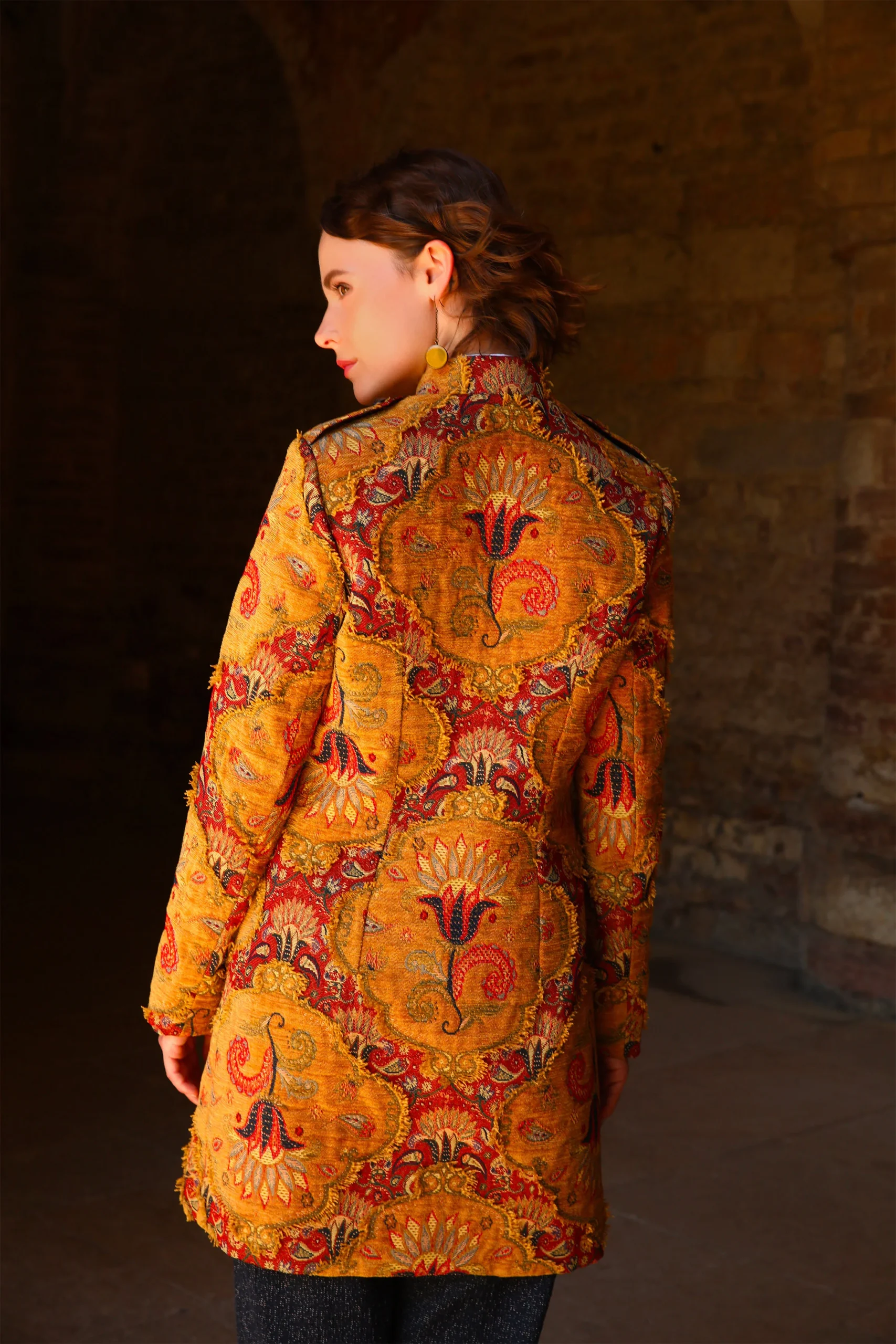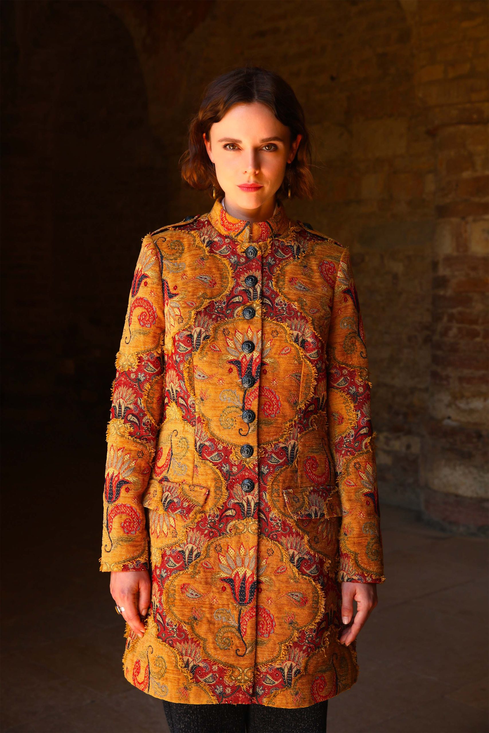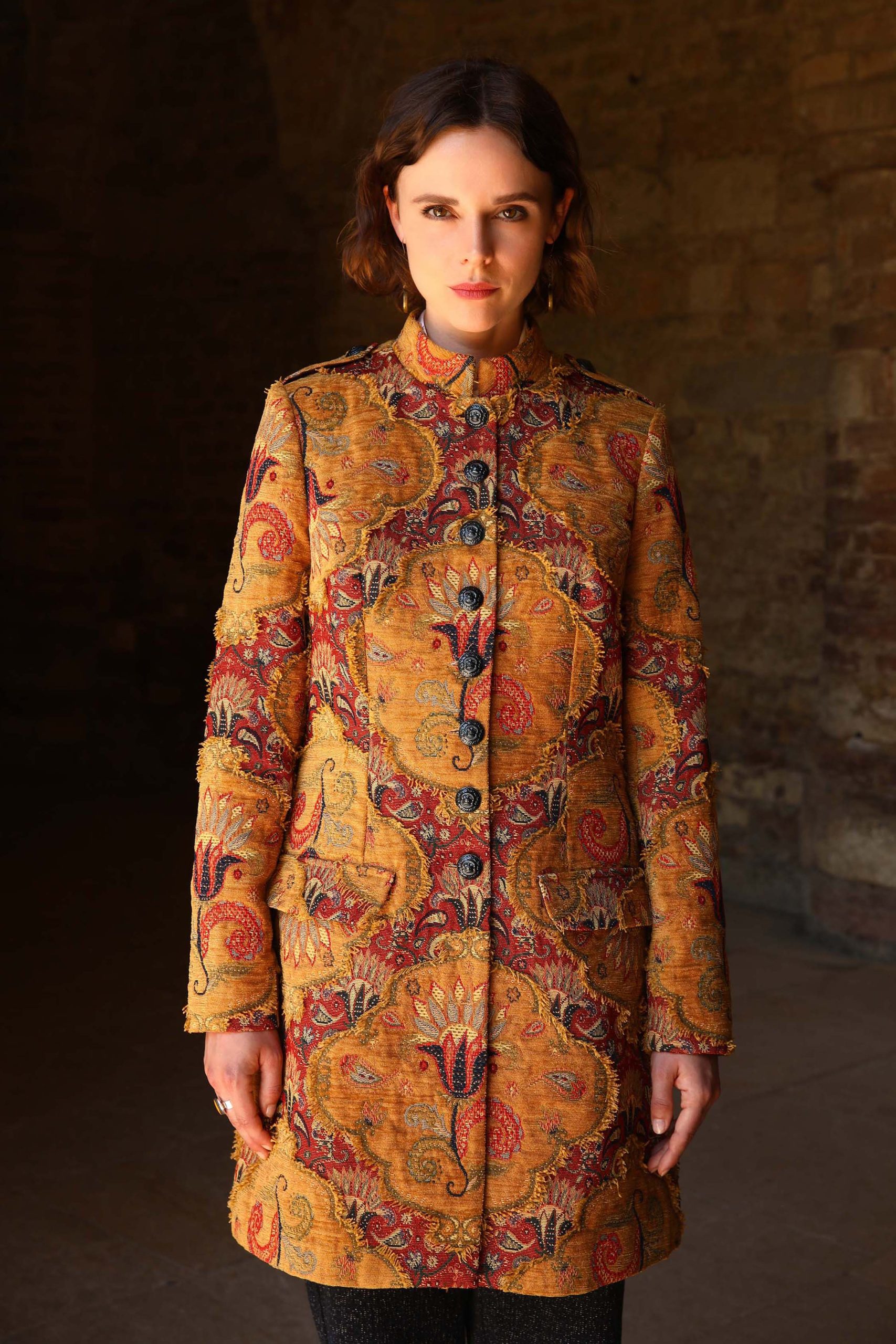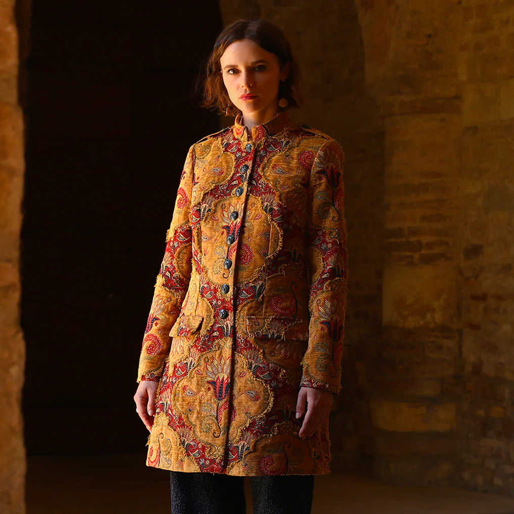 Une matière magnifique réalisée par des ” artistes tisserands ” Un tissage jacquard Une coupe chic, sobre, structurée Composition redingote : 39% polyester, 25% acrylique, 23%coton,3% viscose Composition doublure : 68% acétate, 32% polyester