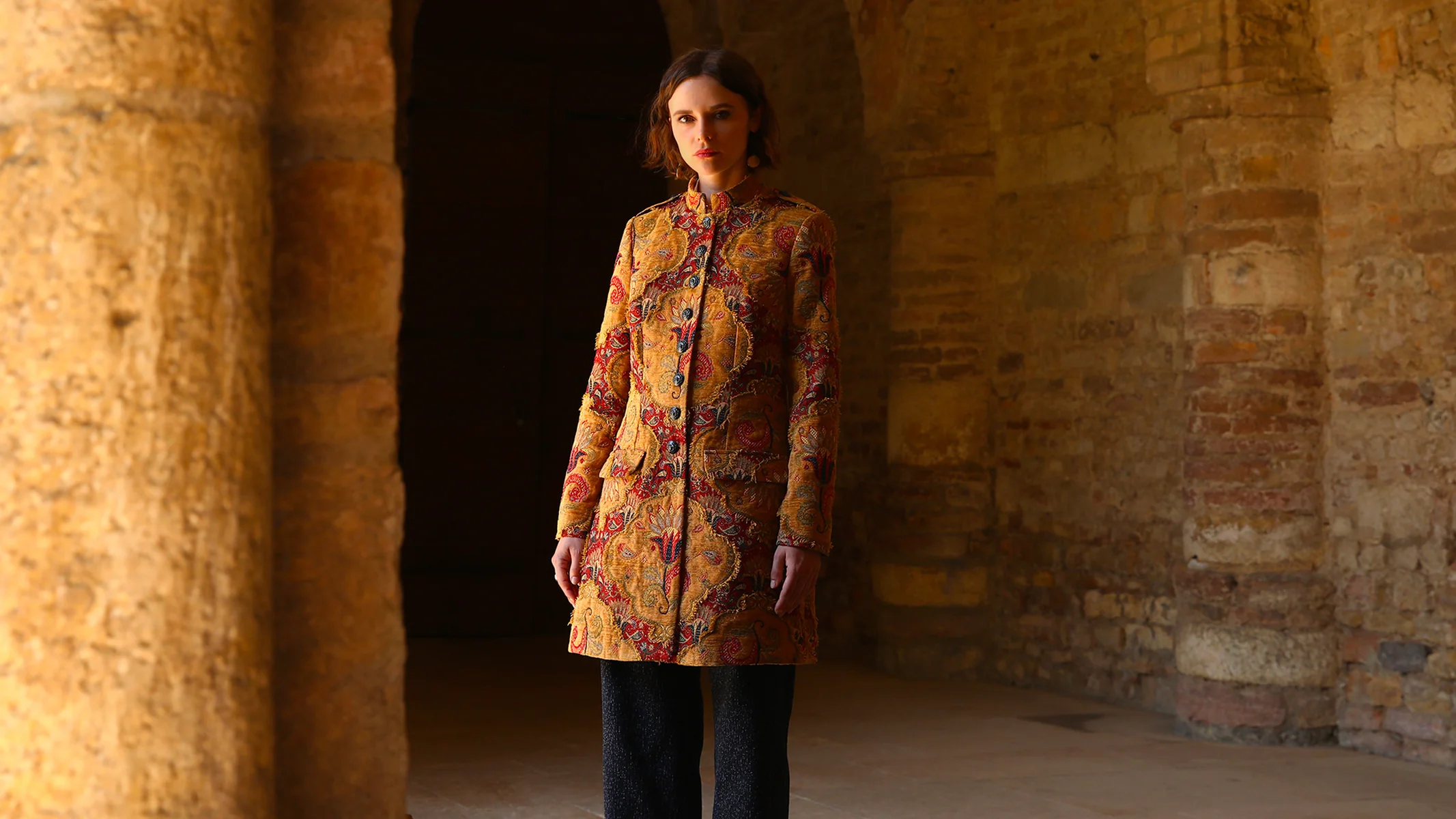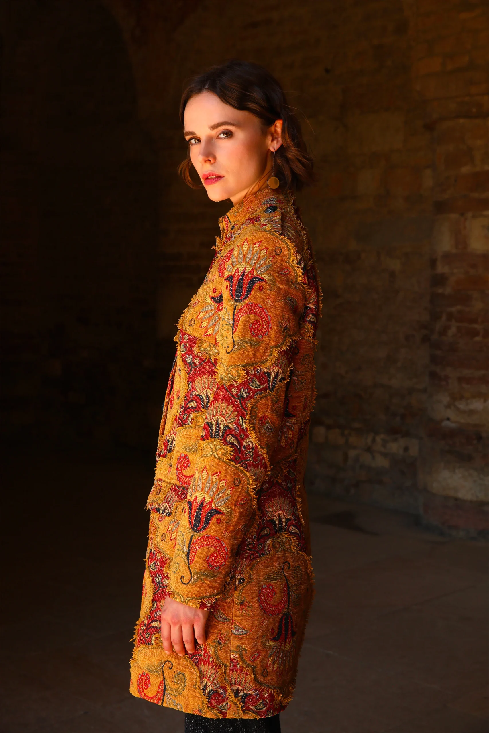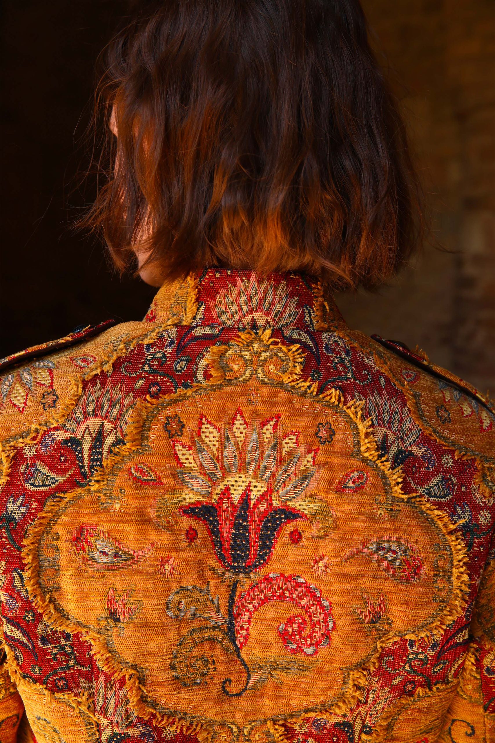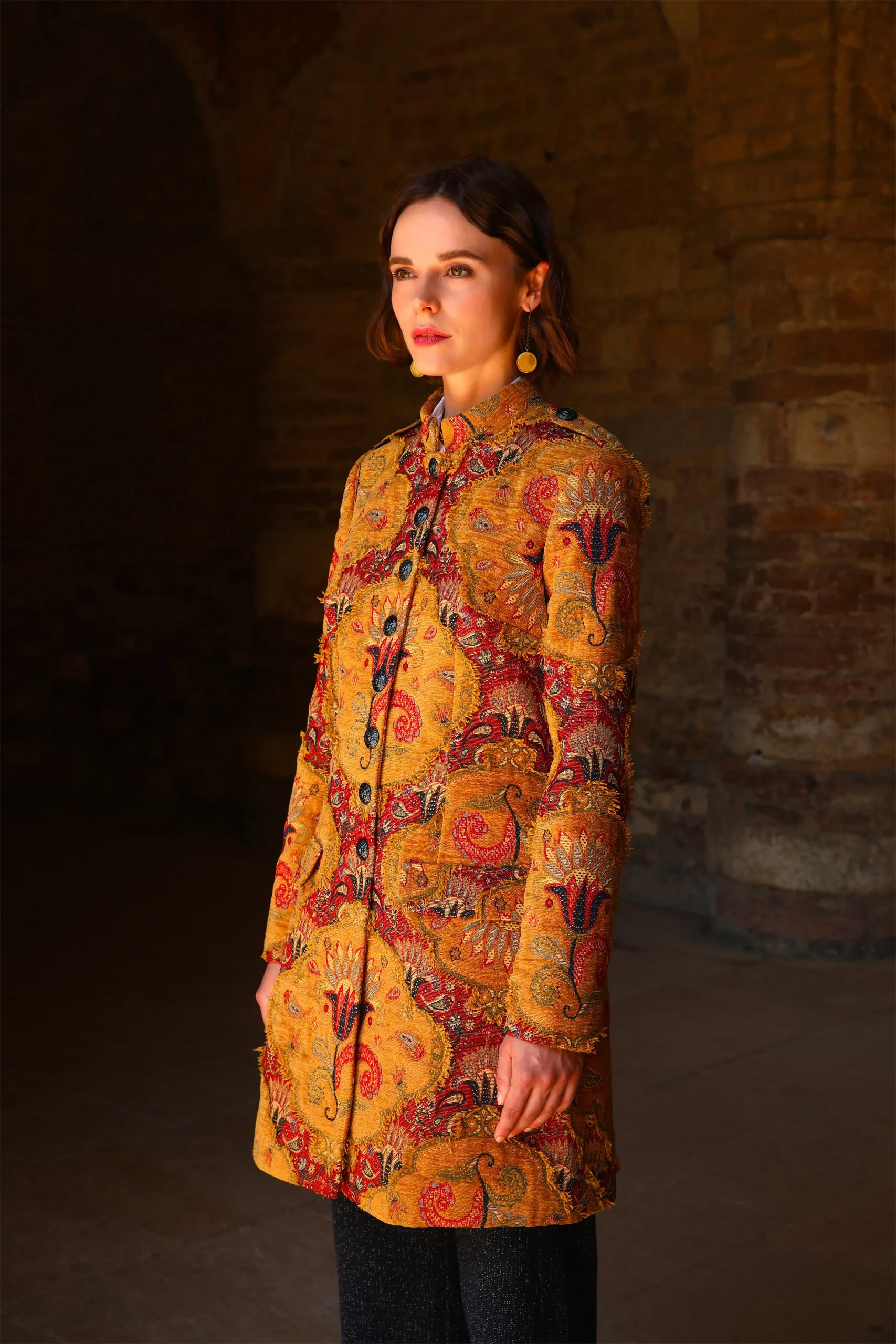 Une matière magnifique réalisée par des ” artistes tisserands ” Un tissage jacquard Une coupe chic, sobre, structurée Composition redingote : 39% polyester, 25% acrylique, 23%coton,3% viscose Composition doublure : 68% acétate, 32% polyester