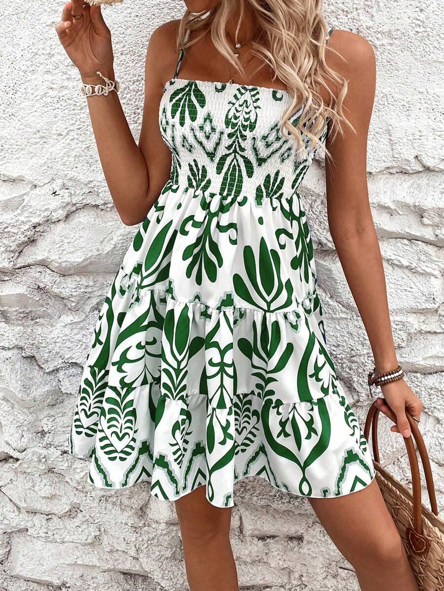 Sans manches Robe évasée à volants taille haute Détails Motifs imprimés tendance bretelles fines encolure carrée Couleurs disponibles : Bleu, Vert, Rouge