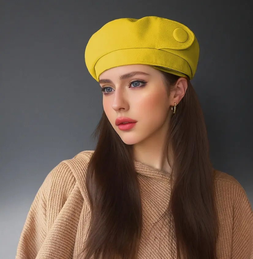 - Forme : Béret classique revisité avec bouton décoratif