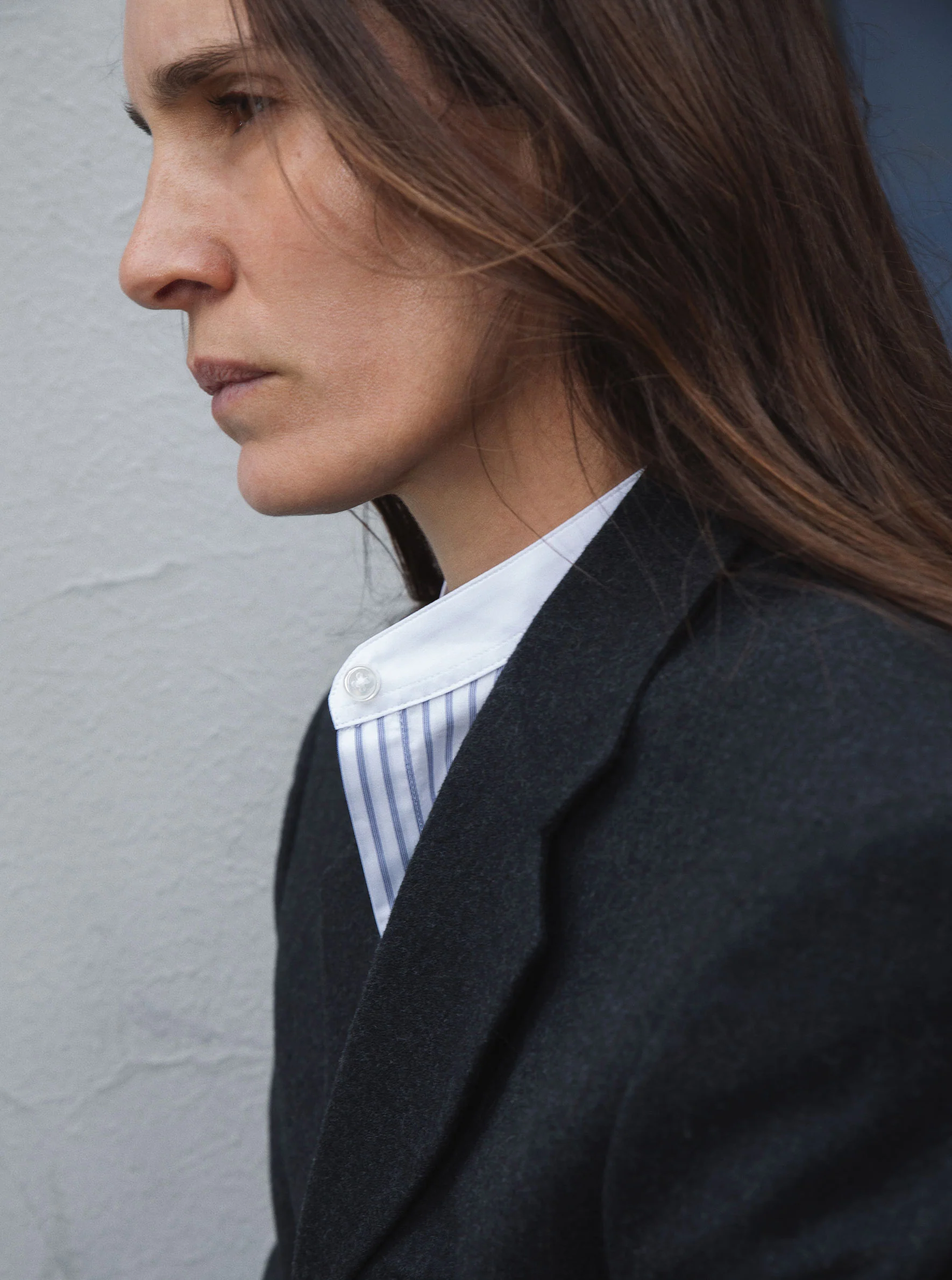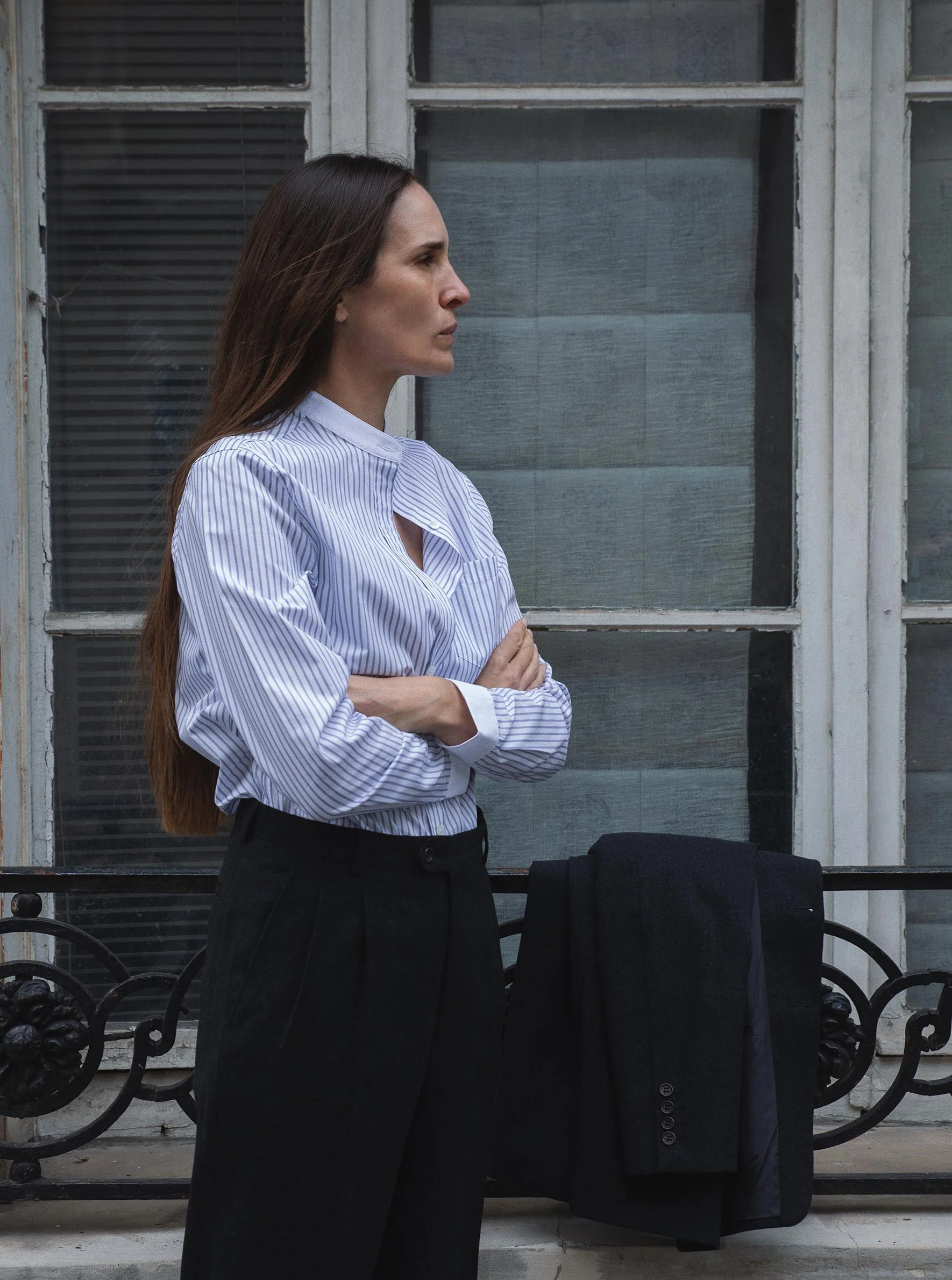 Épurée et structurée, cette chemise à col officier incarne l’essence de Marie Marot — une pièce intemporelle, inspirée du vestiaire masculin et pensée pour toutes les femmes.
