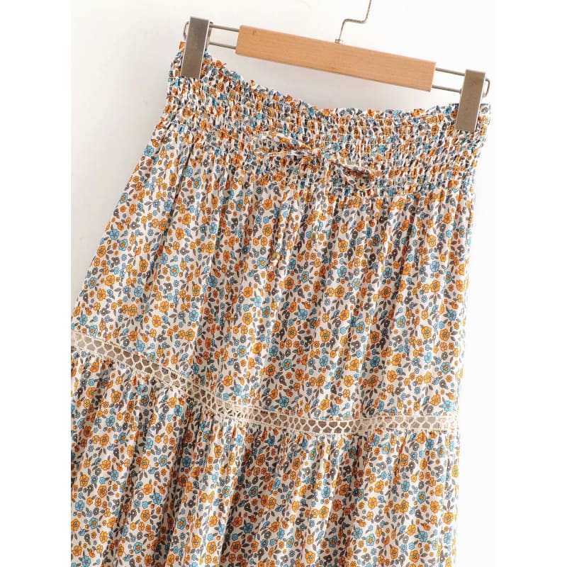 Une jupe longue et évasée avec une taille smockée haute. Un large volant dans le bas et un très joli galon au niveau des hanches et juste au-dessus du volant. Dans un joli tissu beige fleuri, cette jupe vous séduira à cou sûr pour sa fluidité et son charme.
