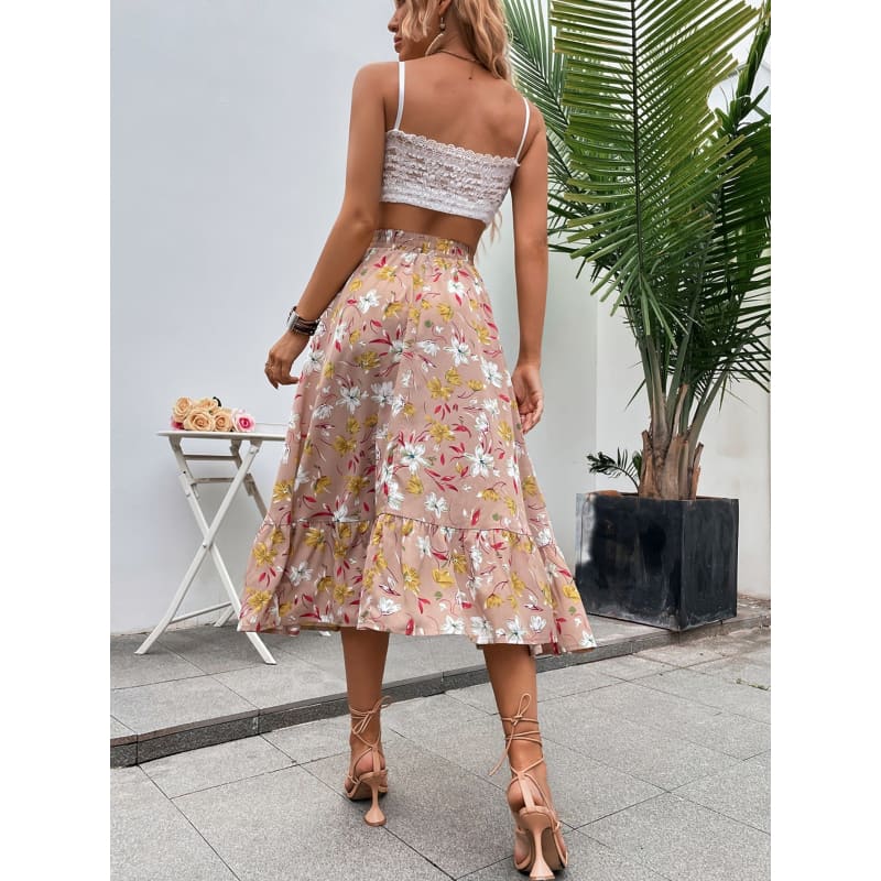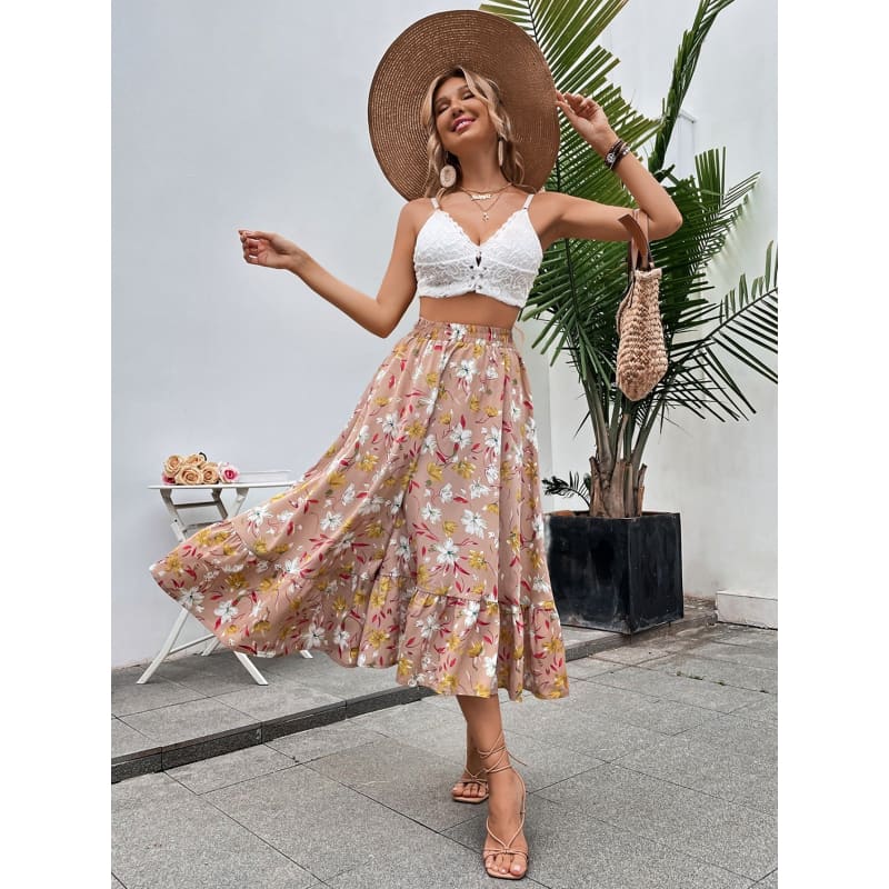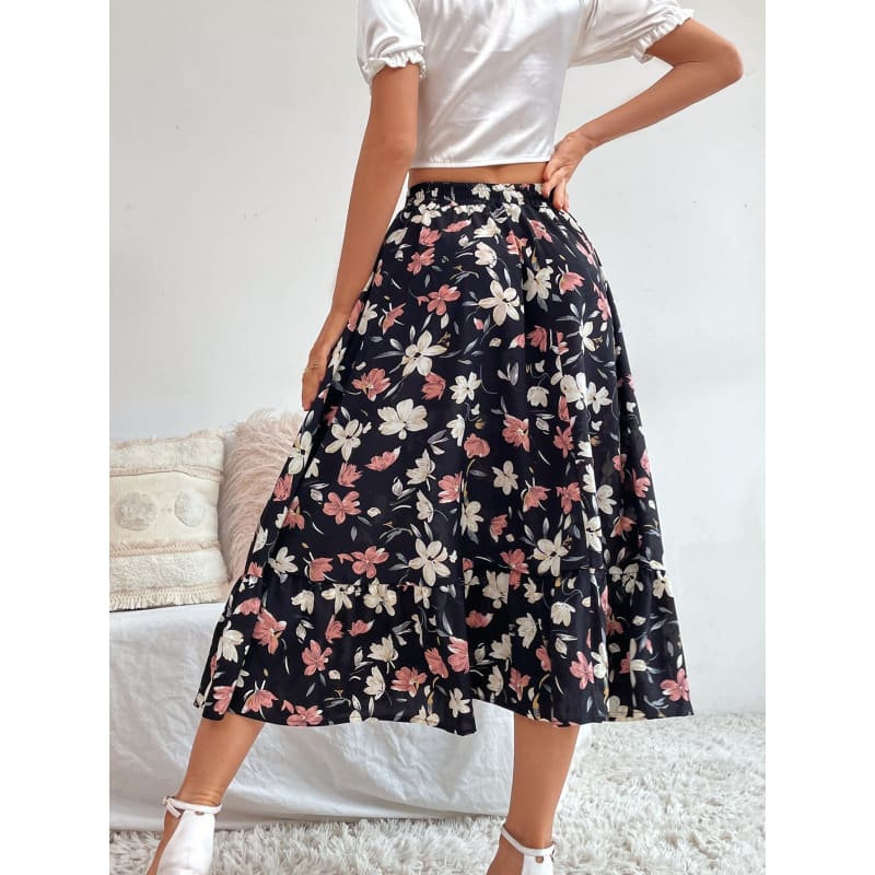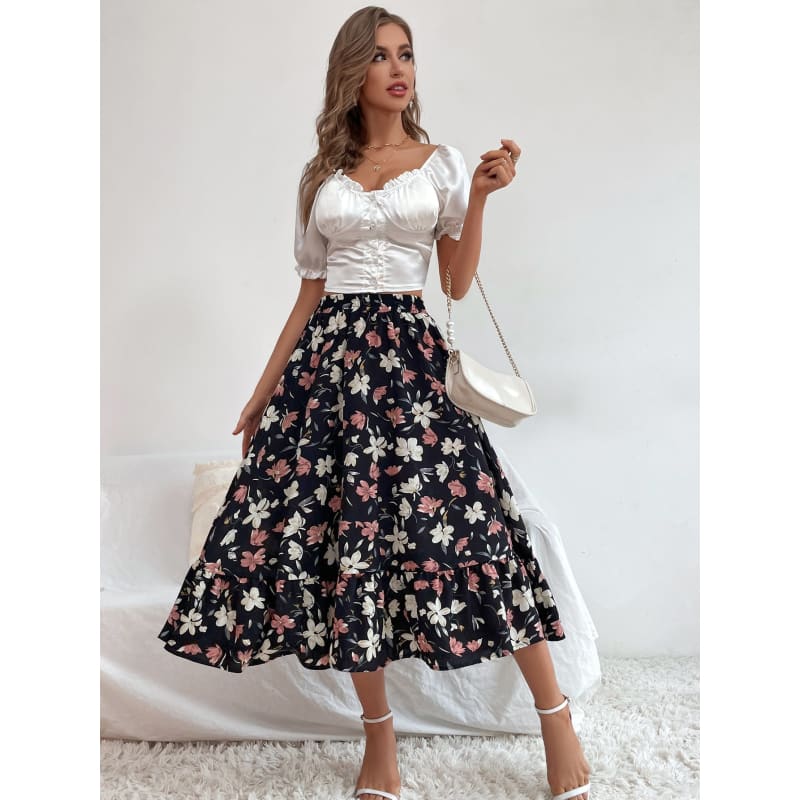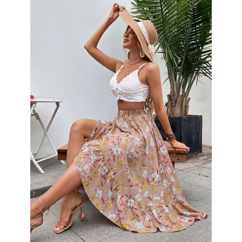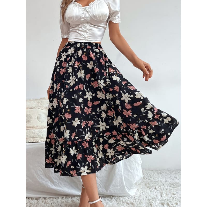 Un tissu à fleur avec un fond clair ou foncé pour cette splendide jupe longue, évasée. Une taille élastique et un large volant dans le bas de jupe. Vous ne passerez pas inaperçue !