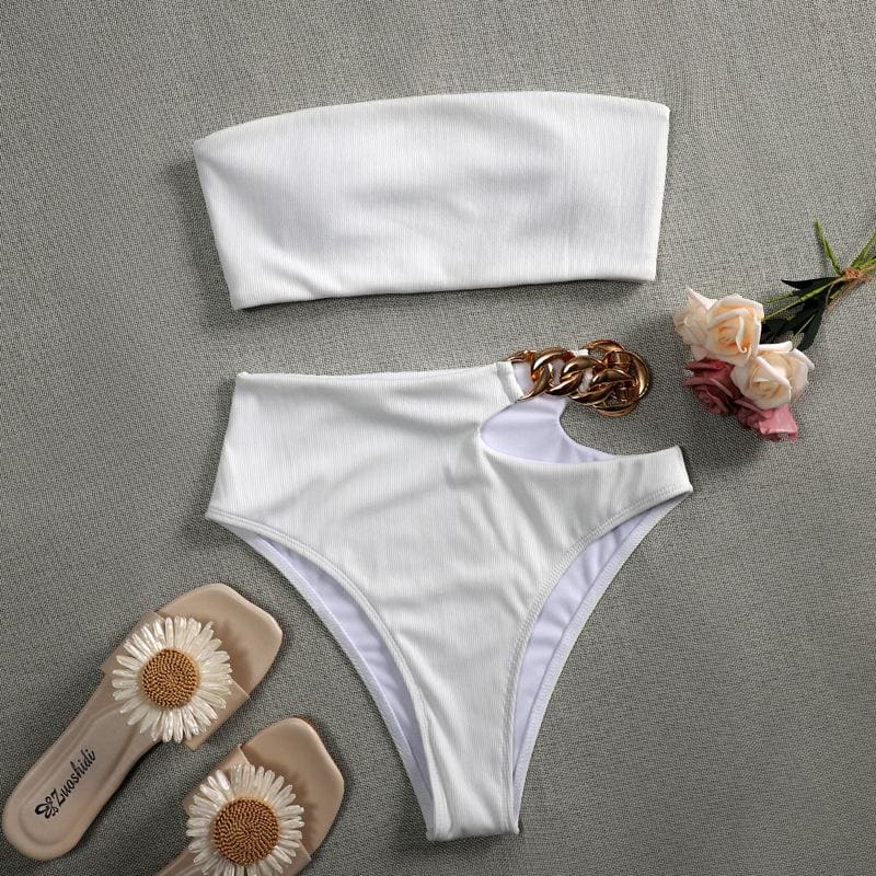 Maillot de bain en deux pièces. Le haut est un bandeau élastique. Pour la culotte, une jolie découpe sur un seul côté et une chaîne en maille vient donner l’élégance à ce maillot.