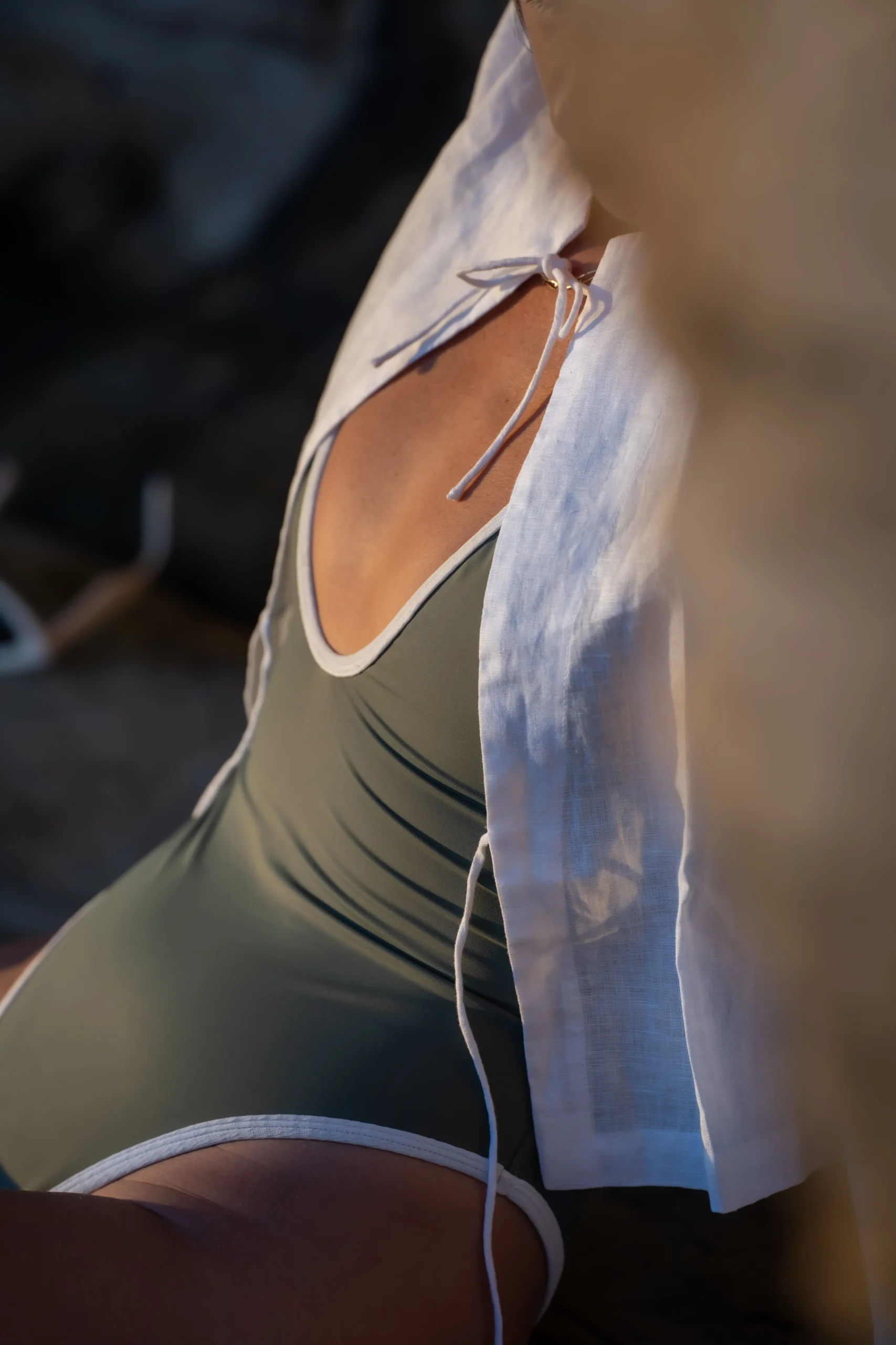 Ce maillot une pièce vert sauge se distingue par son décolleté en V, souligné d’un liseré blanc discret. Sa coupe épouse naturellement les courbes, offrant un maintien confortable grâce à ses bretelles réglables.