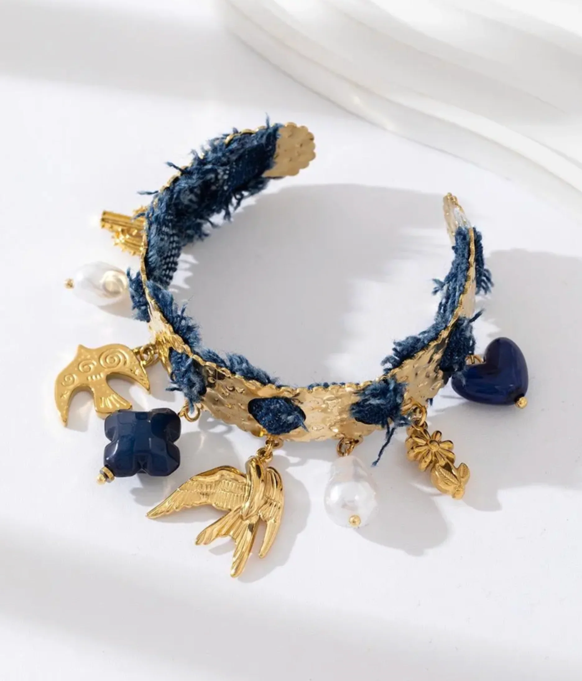 Ce bracelet manchette bleu profond, en tissu légèrement effiloché façon denim, allie esprit bohème, artisanat et symbolique protectrice. Sa base dorée martelée, texturée à la main, est ornée de charms poétiques : colombe, cœur, trèfle, perle blanche, croix stylisée, chaque détail évoque la liberté et l’intuition.