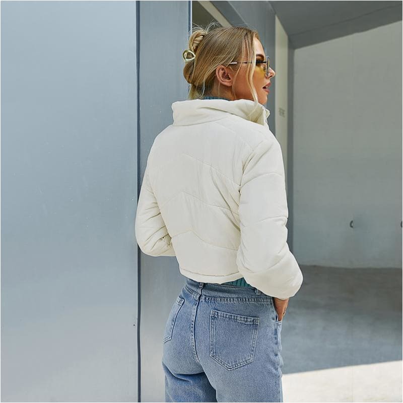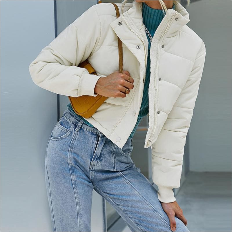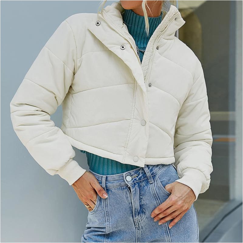 Beau manteau court, de couleur blanche, réalisé dans un tissu épais bien chaud. Col montant, fermeture à glissière et pressions sur le devant.