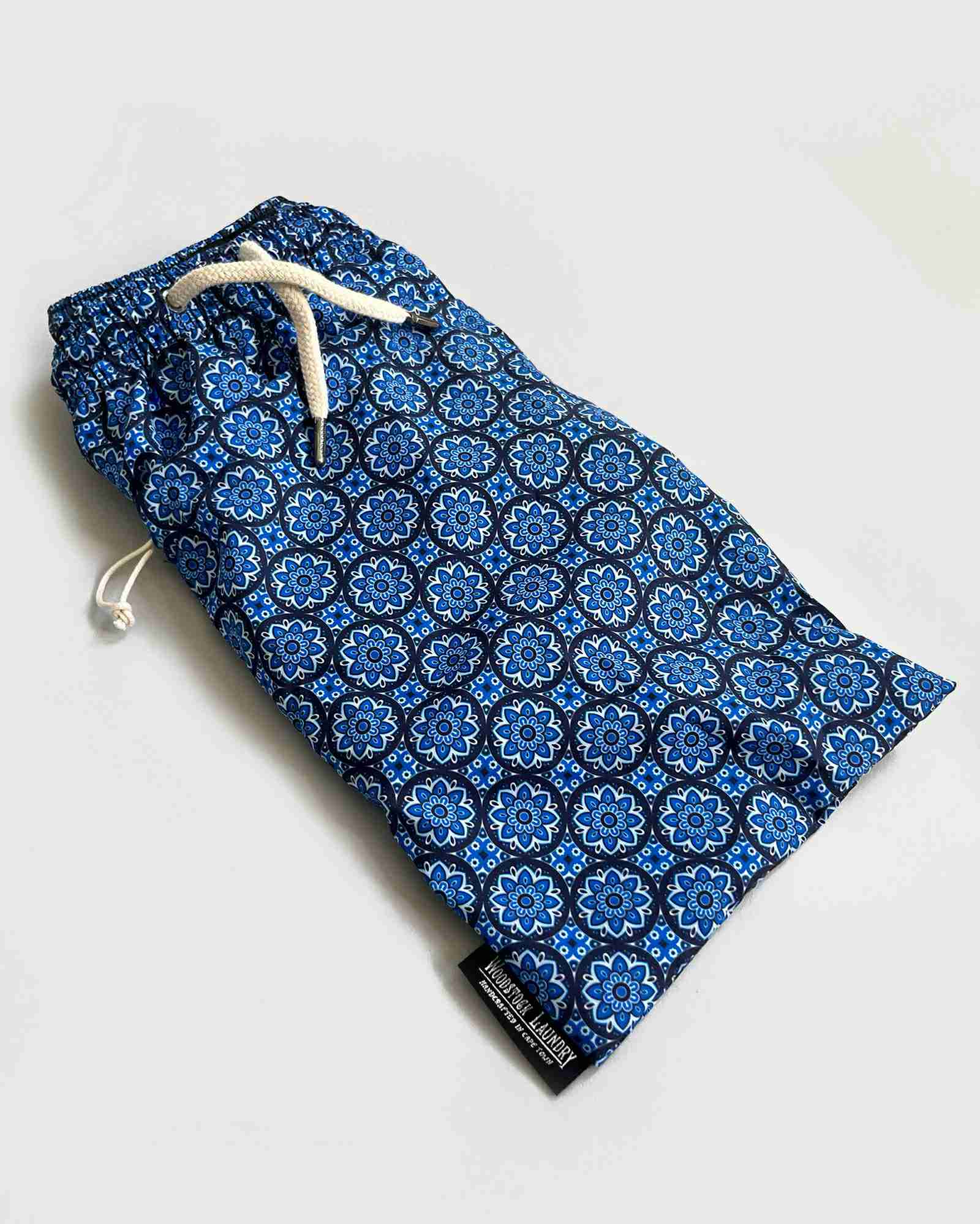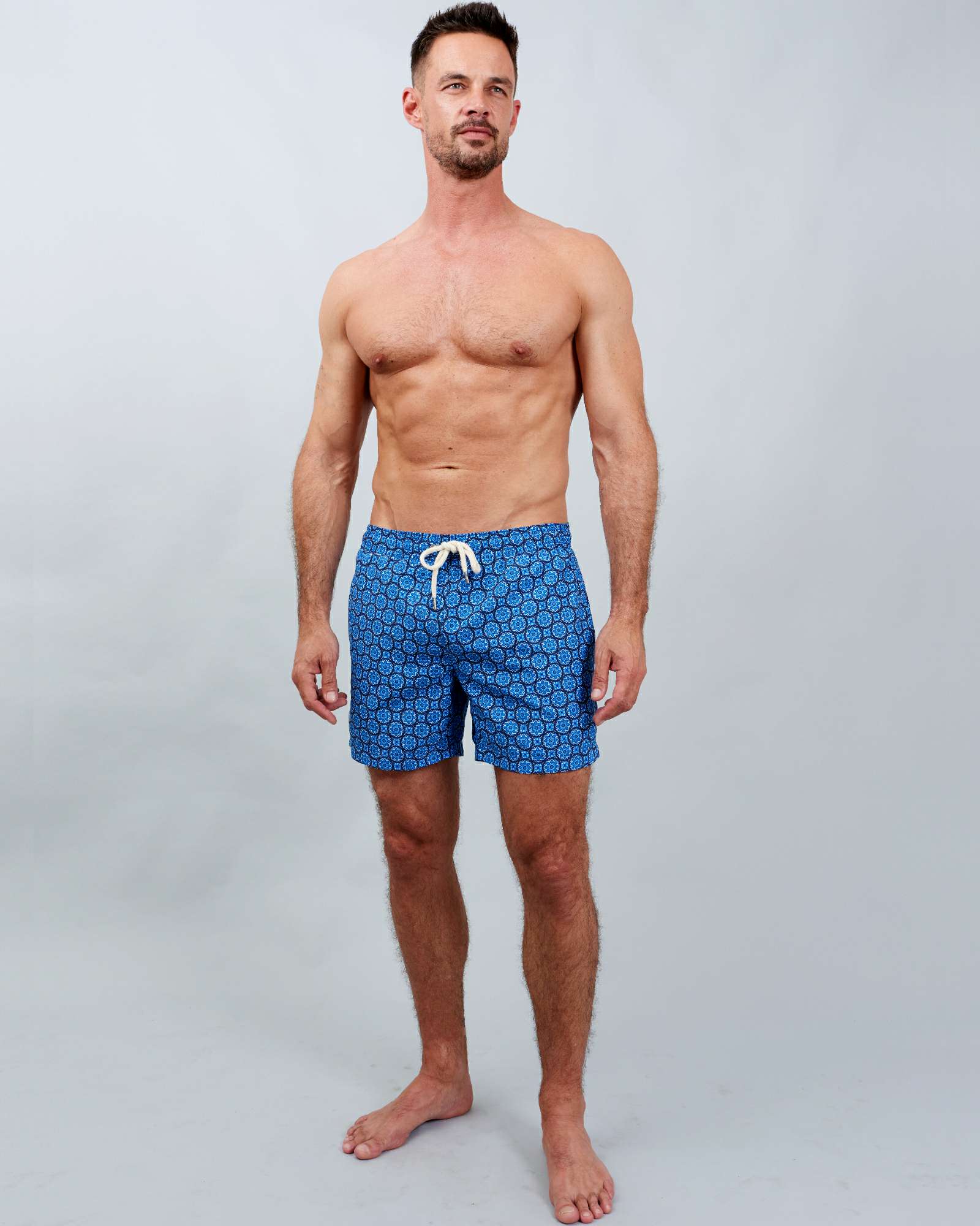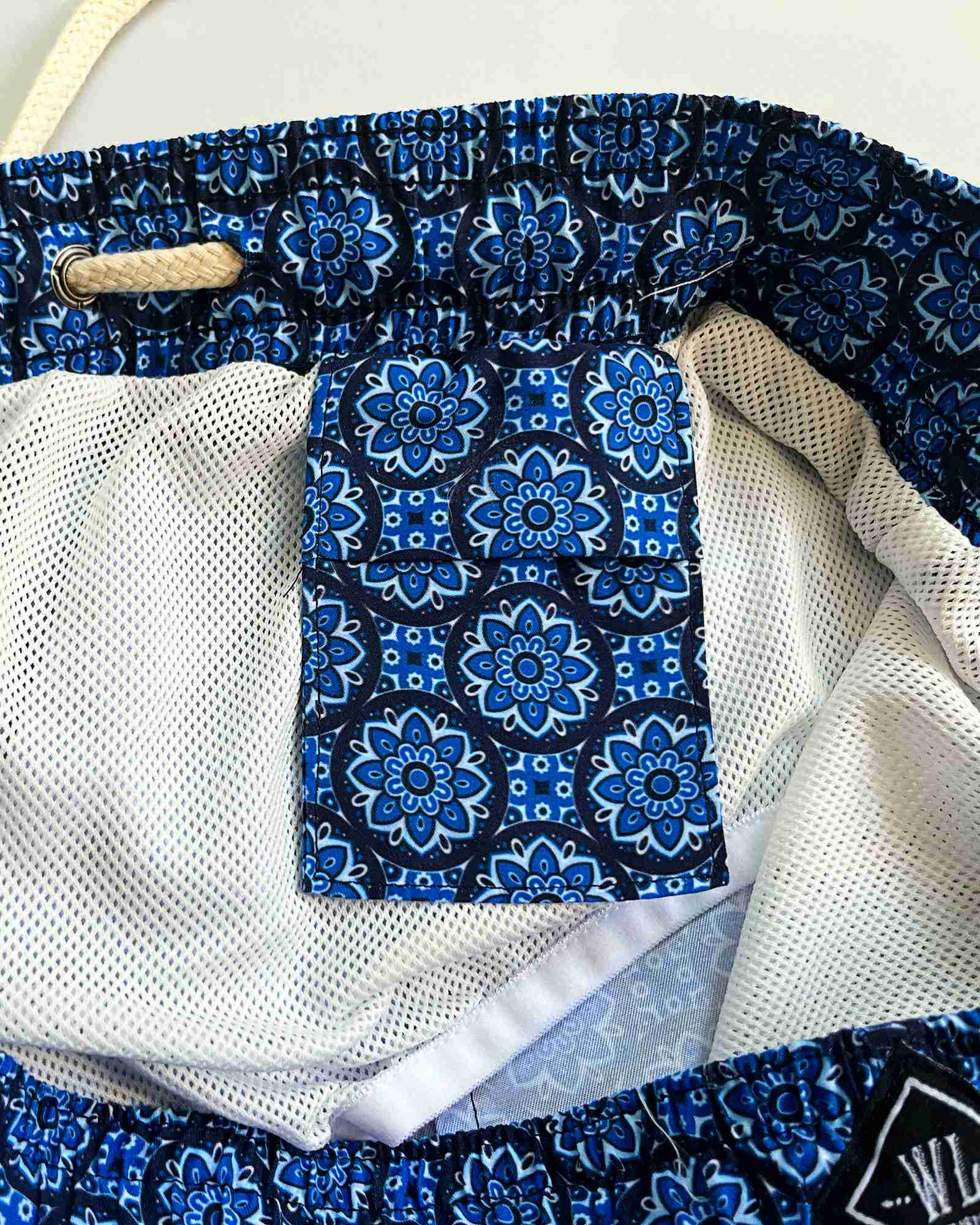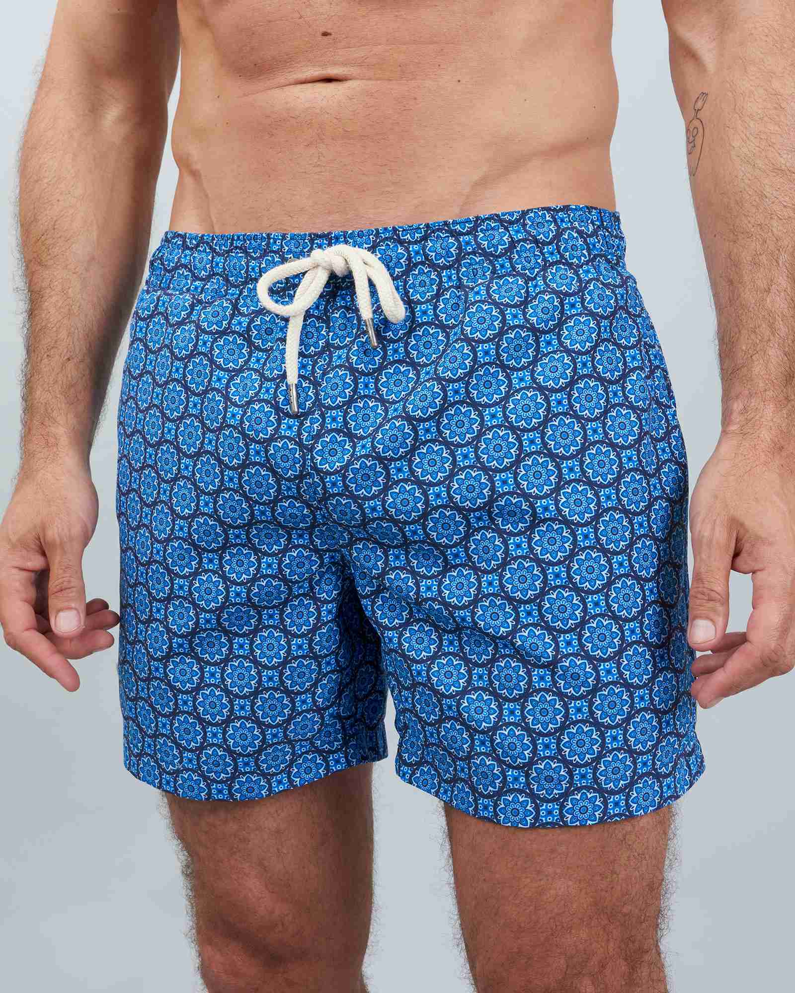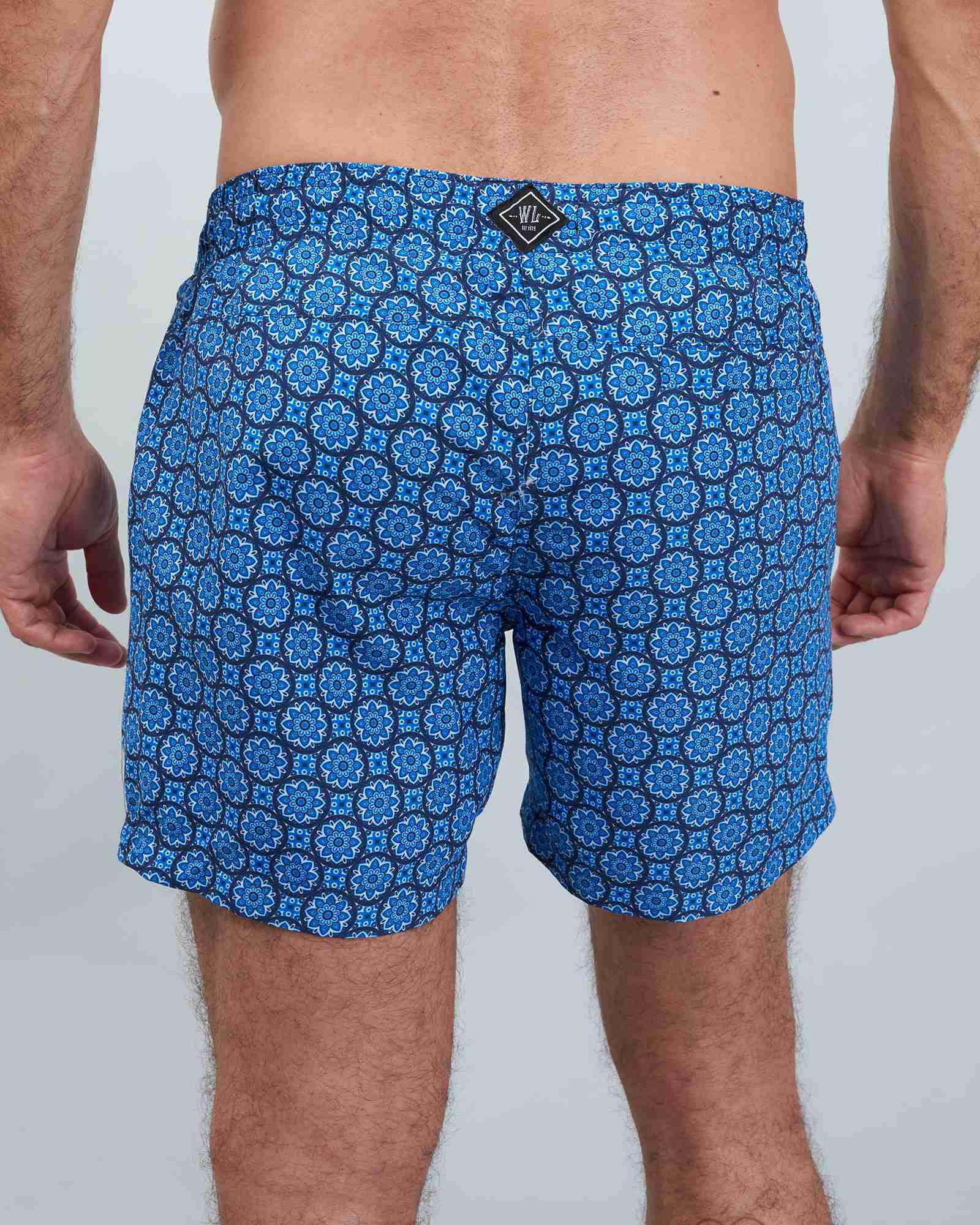 Sport a stylish look with these blue swim shorts, featuring a unique indigo floral design.