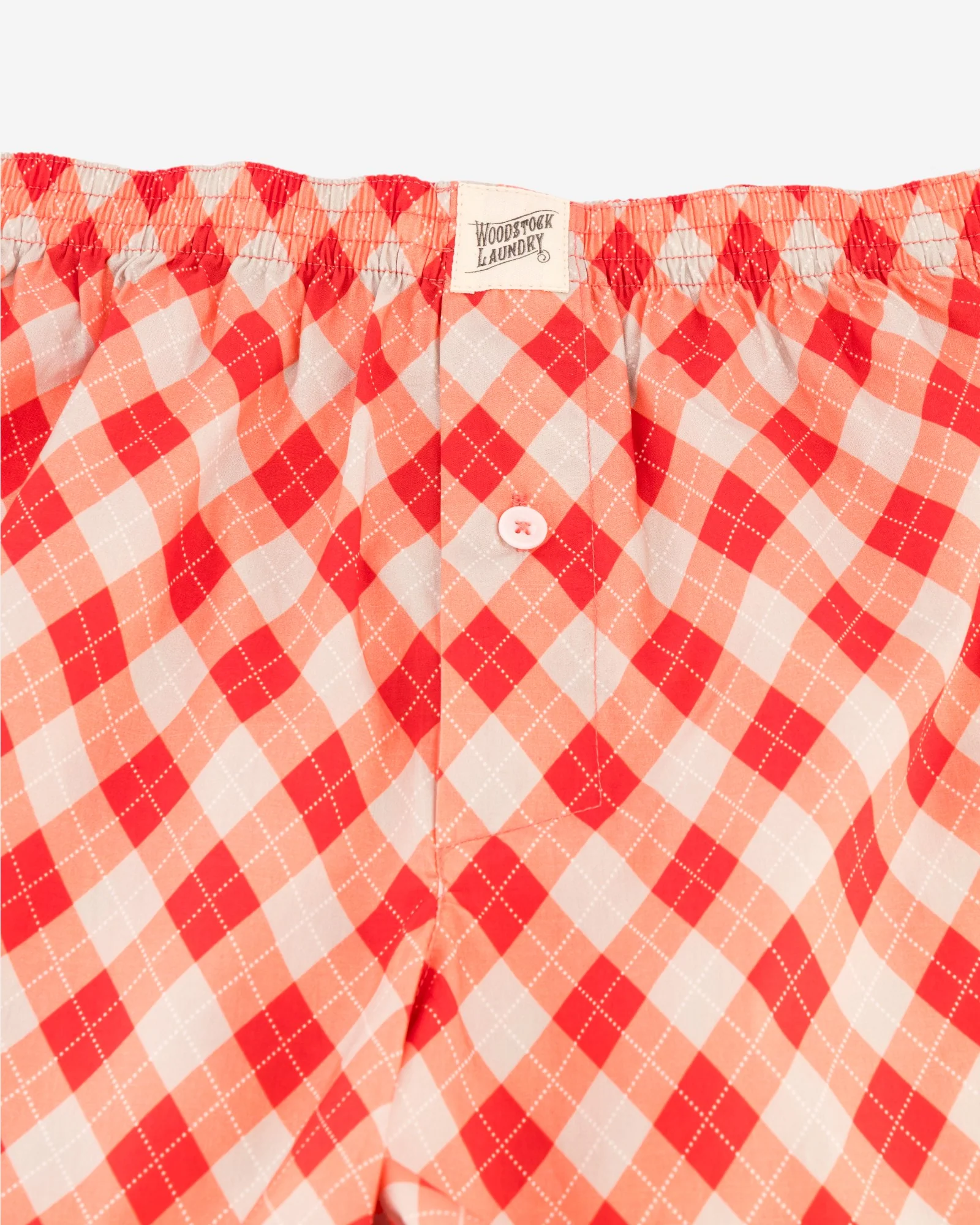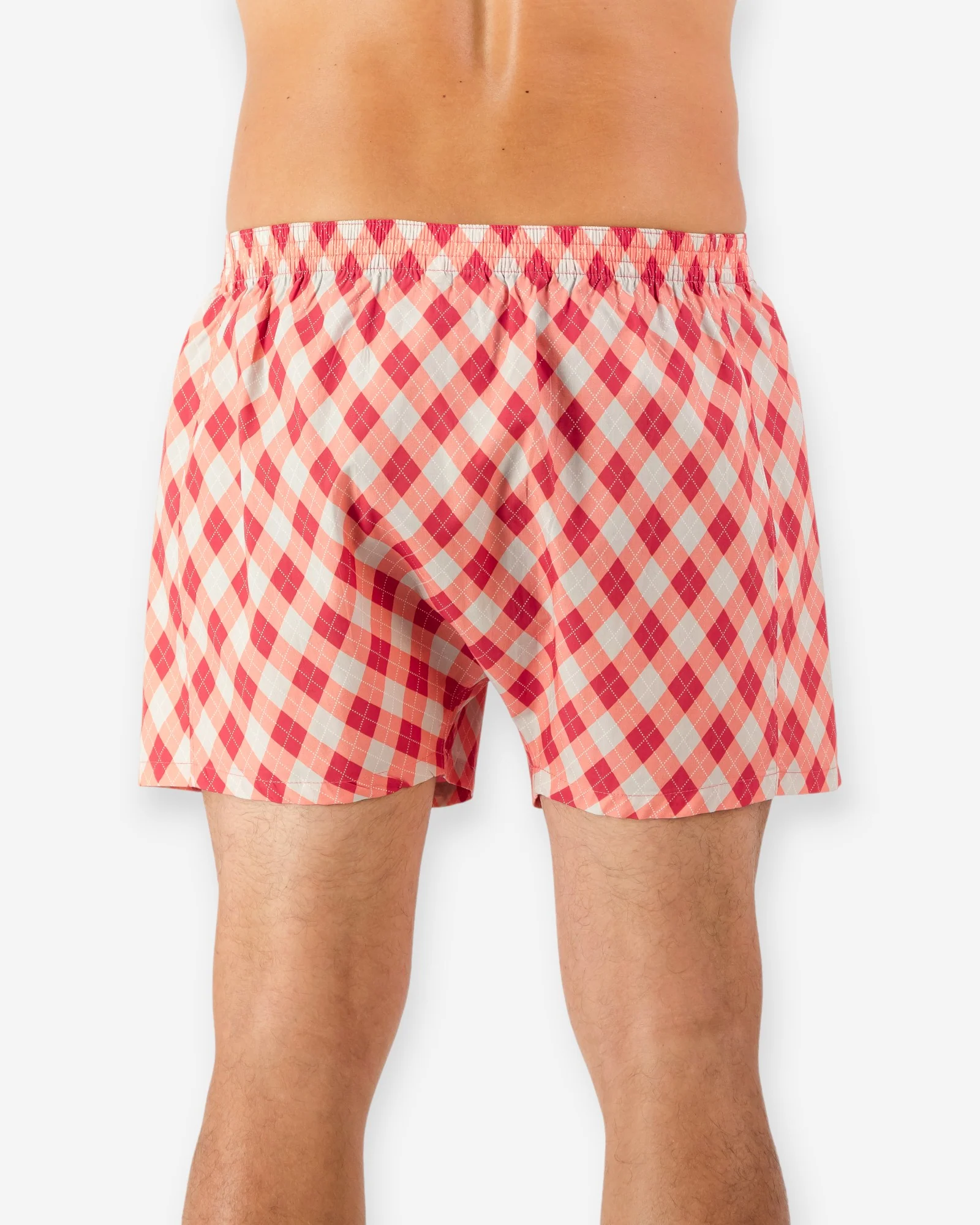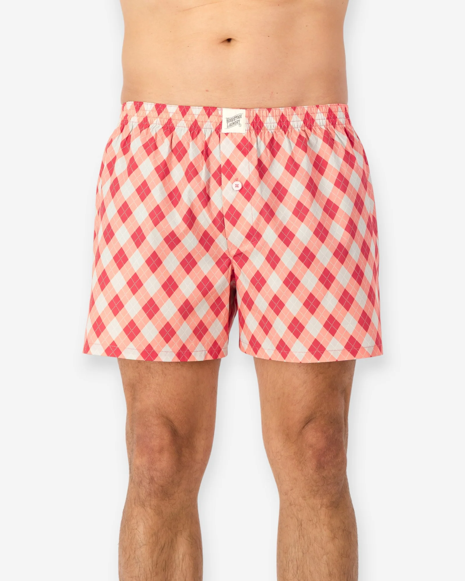 Men’s pink boxer shorts with an Argyle check. Argyle Pink – a diagonal check in soft pink with subtle accents, reimagining a heritage pattern in a fresh, modern palette. Breathable cotton poplin with a cool, refined feel Exceptionally smooth feel, crafted for durability Relaxed silhouette for everyday ease Made responsibly in small batches
