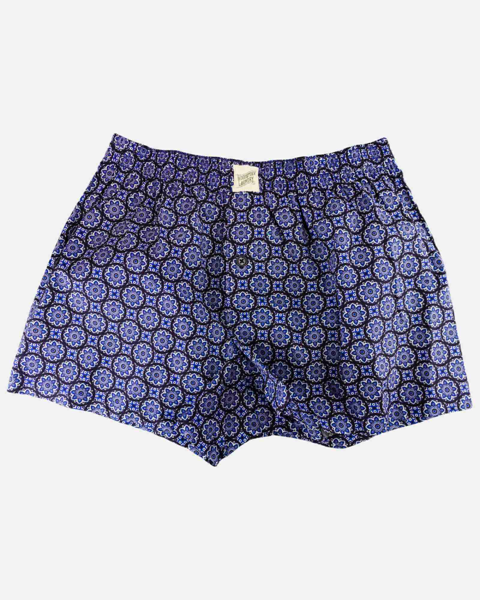 Floral boxers for men in rich indigo tones. Indigo Floral – Deep indigo poplin with dark blue floral motifs and soft white accents. Refined, understated, and confidently bold. Breathable cotton poplin with a cool, refined feel Exceptionally smooth feel, crafted for durability Relaxed silhouette for everyday ease Made responsibly in small batches