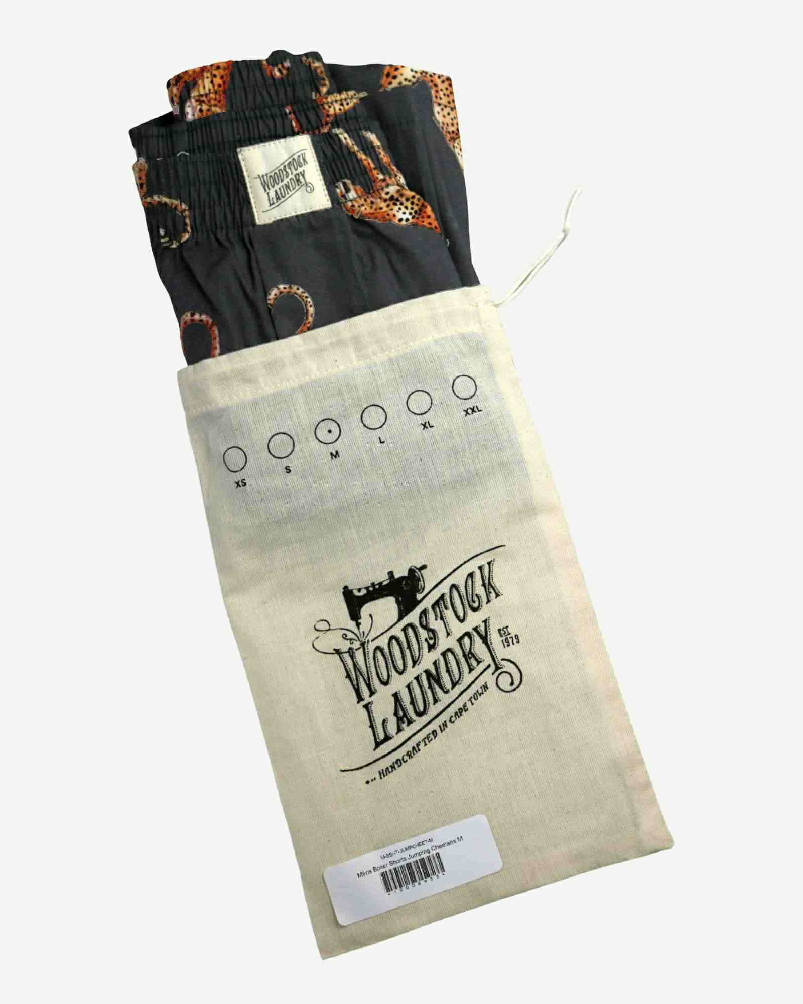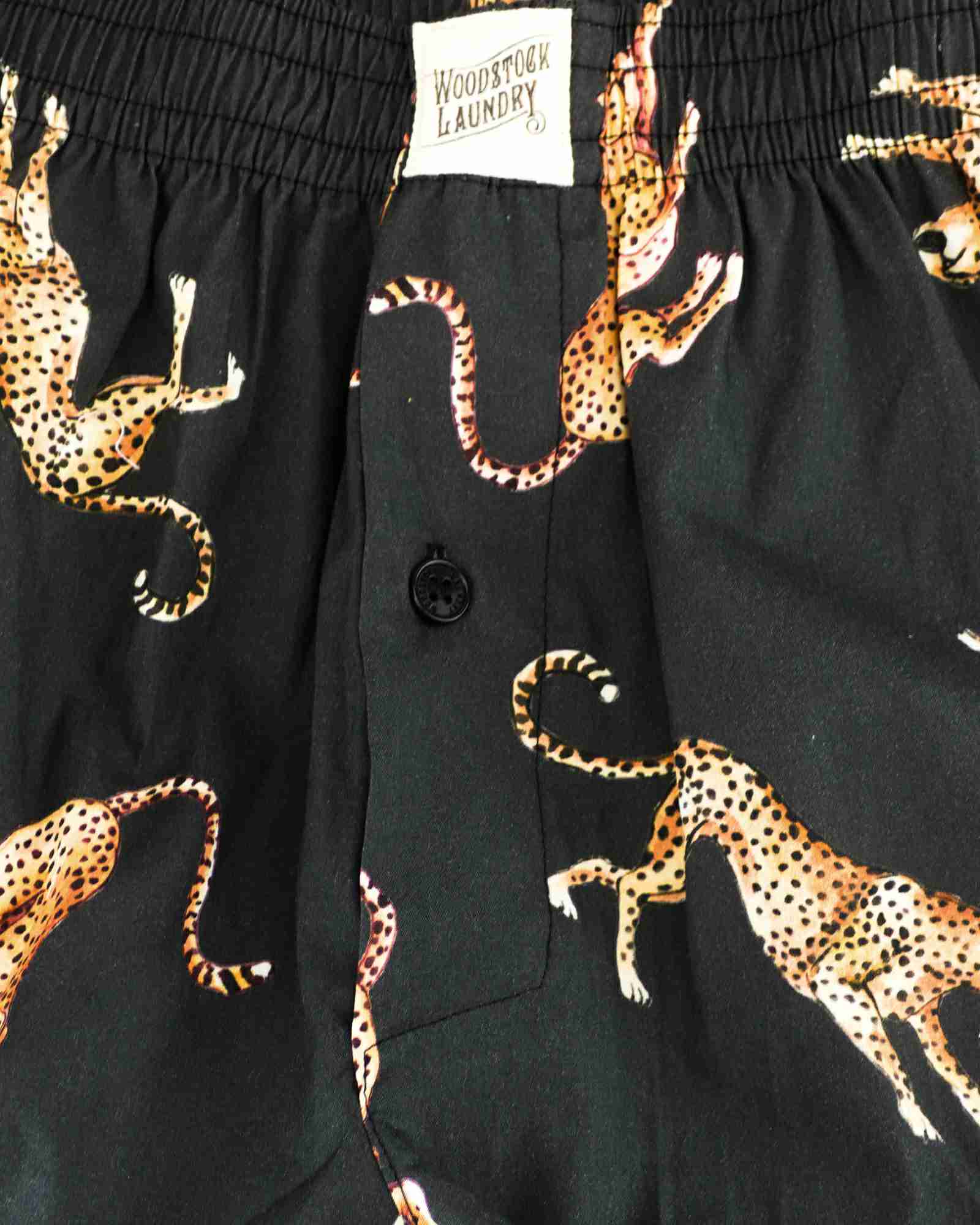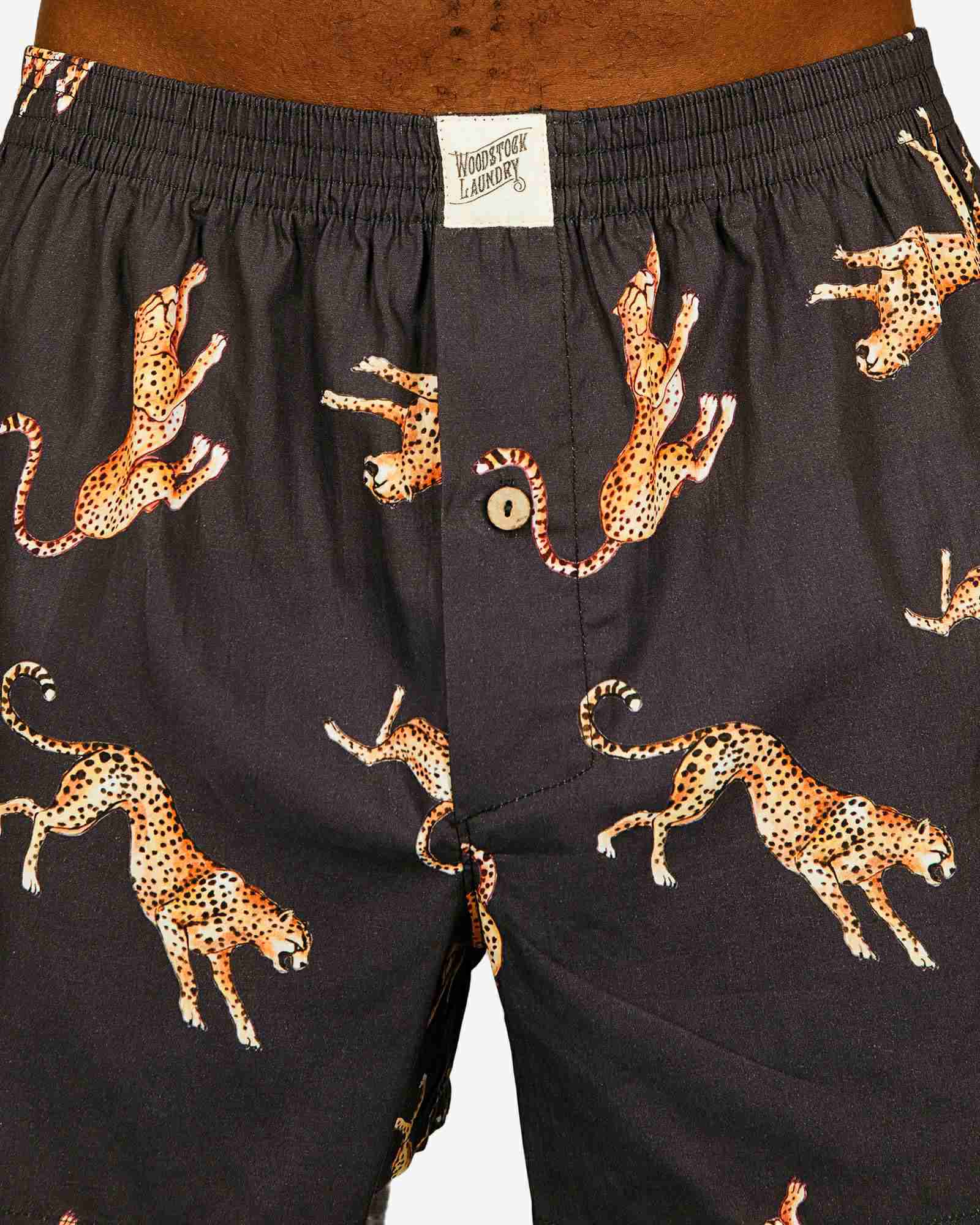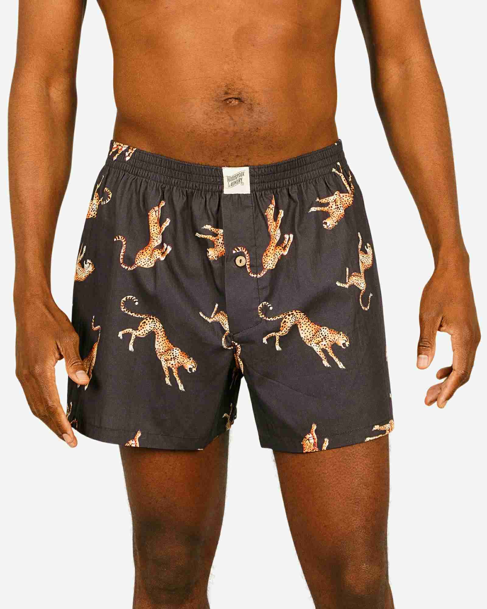 Mens black boxers with a bold cheetah print. Jumping Cheetah – Sleek black poplin with cheetahs mid-leap. Dynamic, graphic, and built with attitude. Breathable cotton poplin with a cool, refined feel Exceptionally smooth feel, crafted for durability Relaxed silhouette for everyday ease Made responsibly in small batches