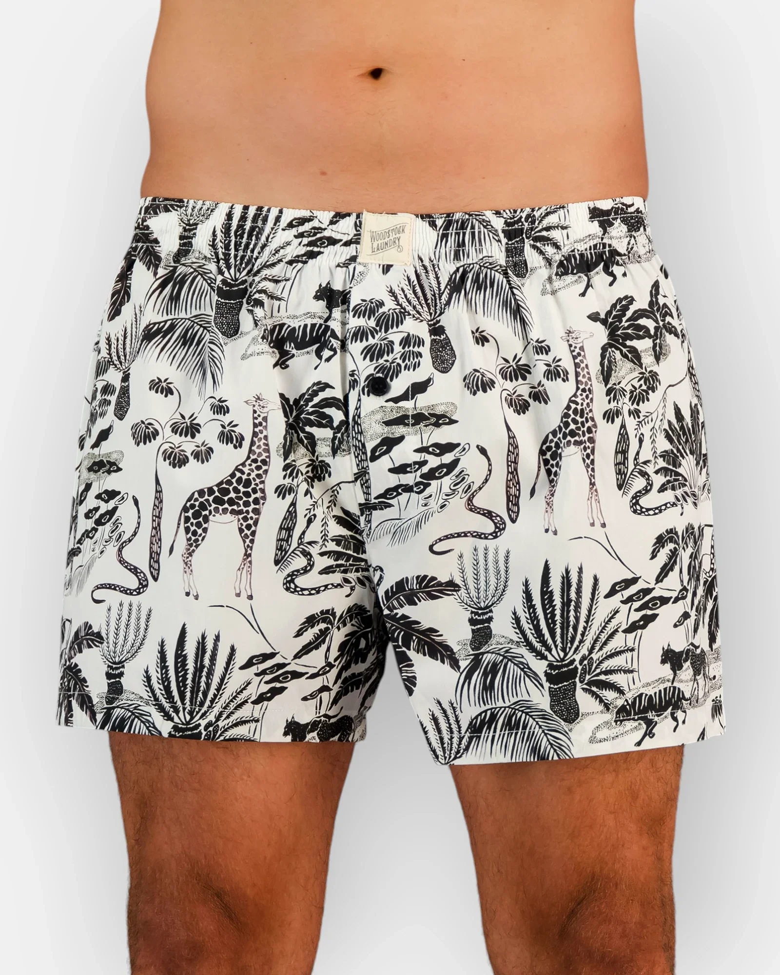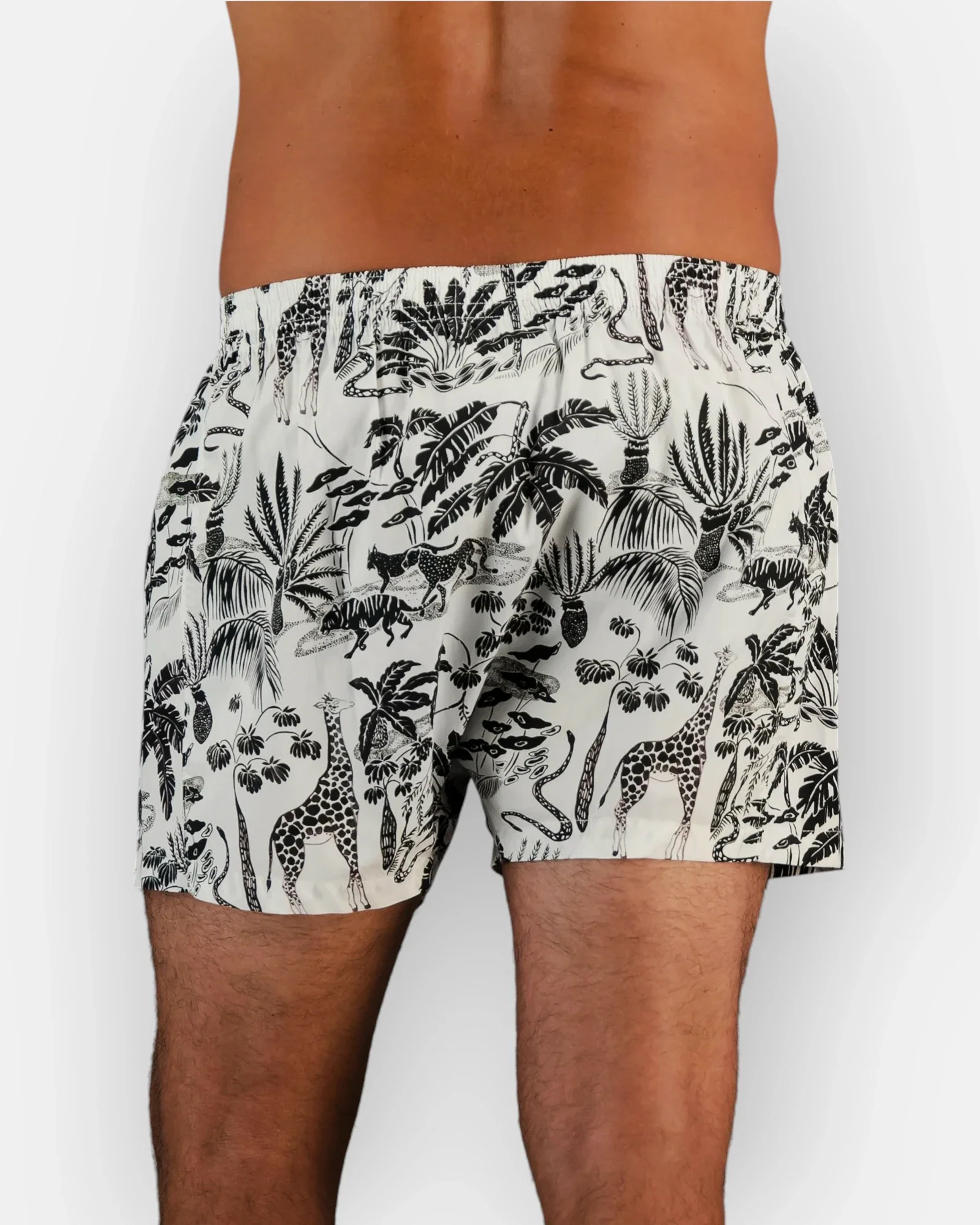 White boxers for men with a playful black safari print. Mono Safari Black – Crisp white poplin covered in hand-drawn giraffes, snakes, and palm trees. Playful, sharp, and full of character. Breathable cotton poplin with a cool, refined feel Exceptionally smooth feel, crafted for durability Relaxed silhouette for everyday ease Made responsibly in small batches