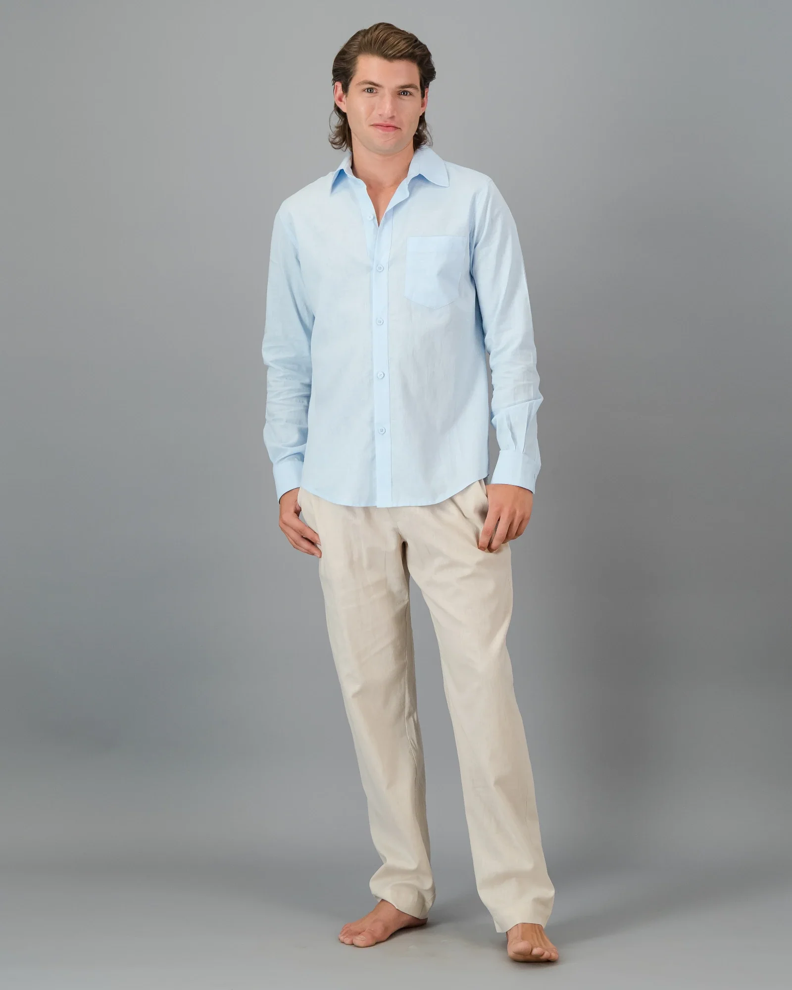 Supersoft long sleeve light blue linen shirt for men, offering unmatched comfort.