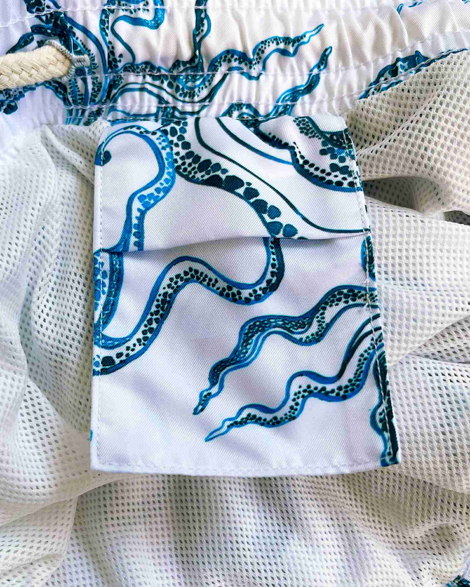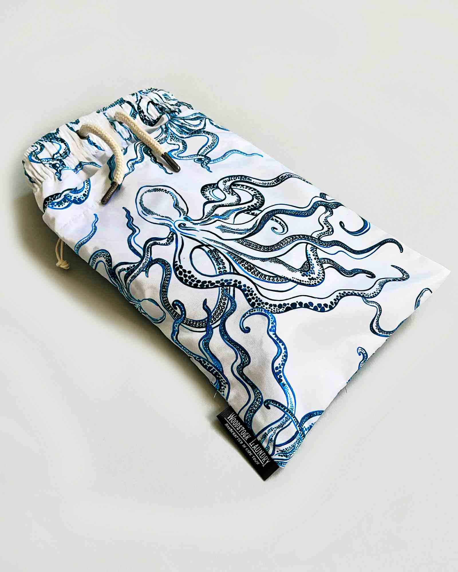 Sport a stylish and sustainable look with these swim shorts, featuring a unique design of indigo octopuses against a crisp white background.