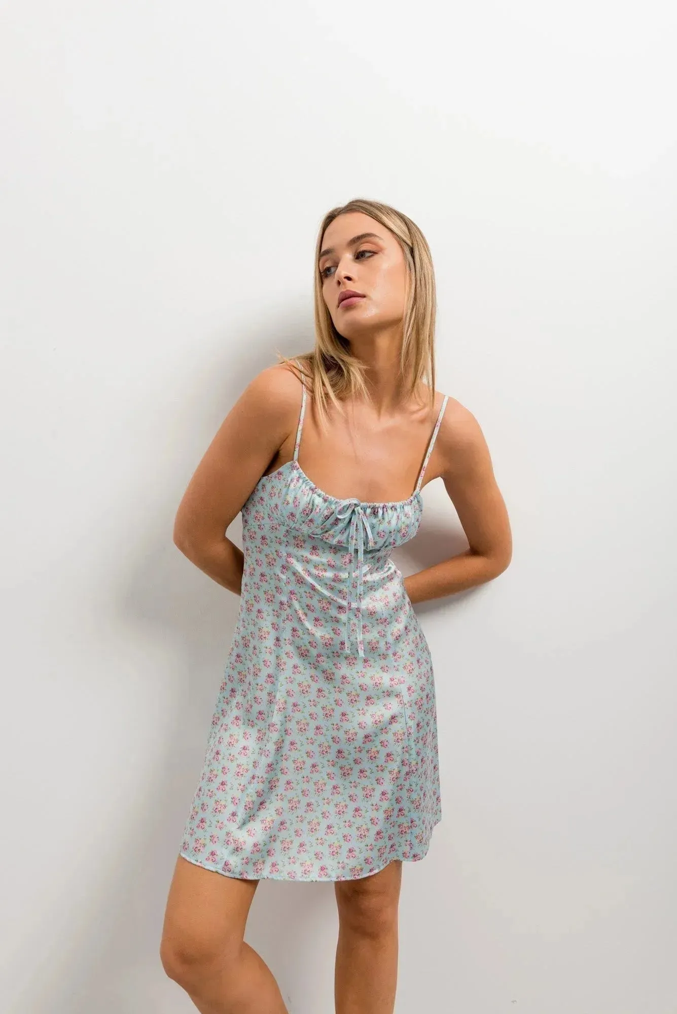 Découvrez notre Mini Robe Satin Bleu Pastel à Fleurs