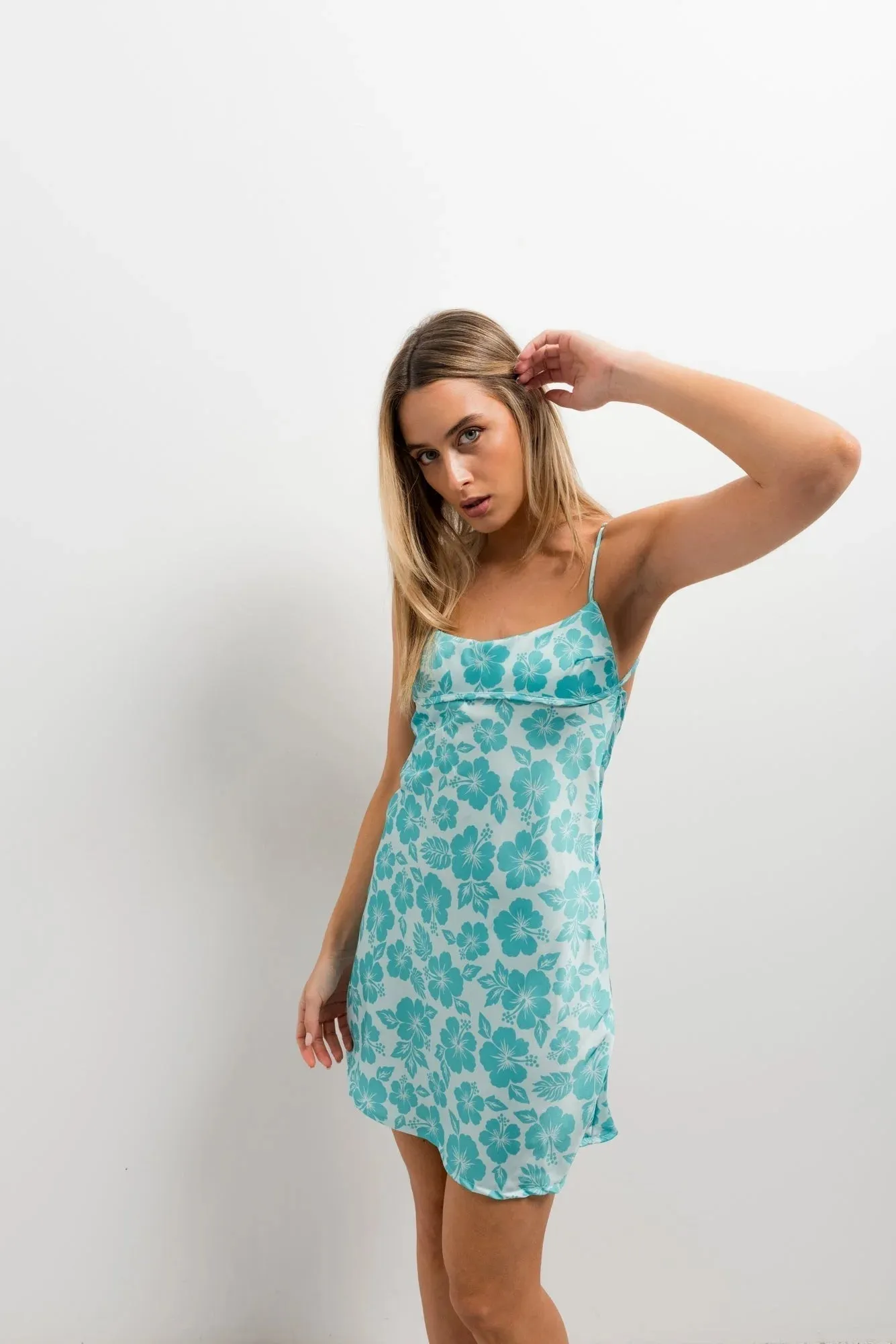 Distinguez-vous avec notre mini robe satinée turquoise fleurie
