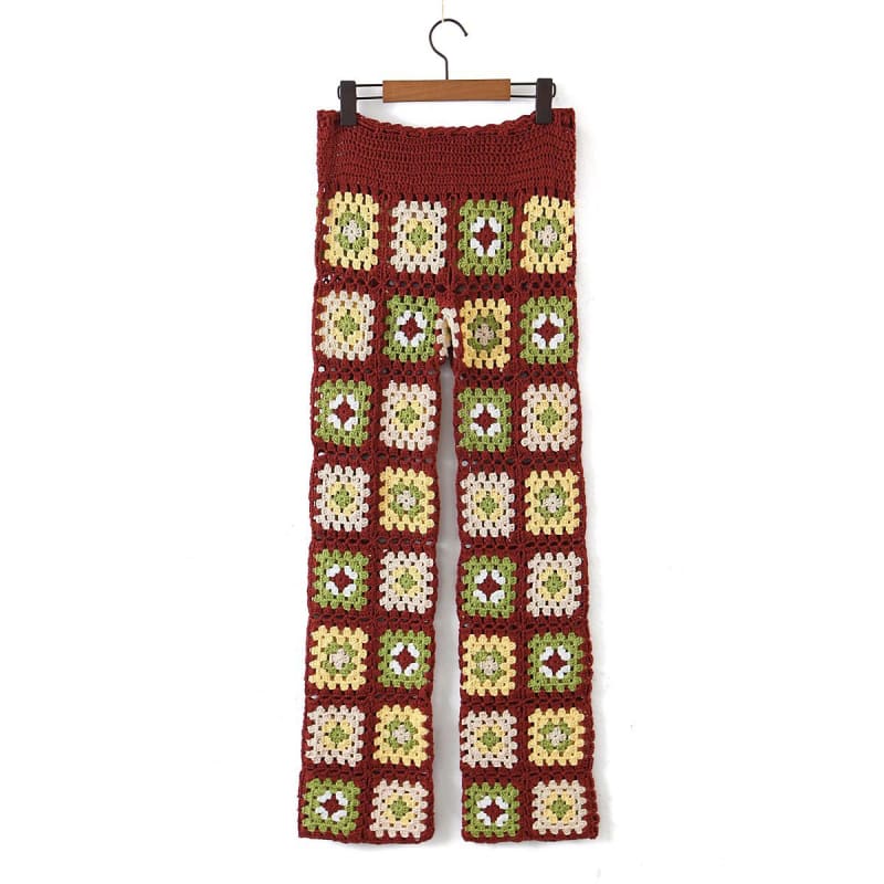 Carrés fleuris assemblés pour ce pantalon en crochet. Ceinture à nouer par cordon à la taille. Très beau mélange de couleurs. Vous allez tomber sous son charme !