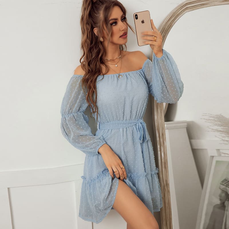 Disponible en trois coloris, cette robe courte est réalisée dans un tissu flocké double épaisseur. Manches longues en voile terminée par un élastique. Ceinture à nouer à la taille, très belle encolure bateau. La robe que votre dressing attend ! Type d’article : robe Épaisseur : fine Matériel : coton / polyester Longueur : courte […]