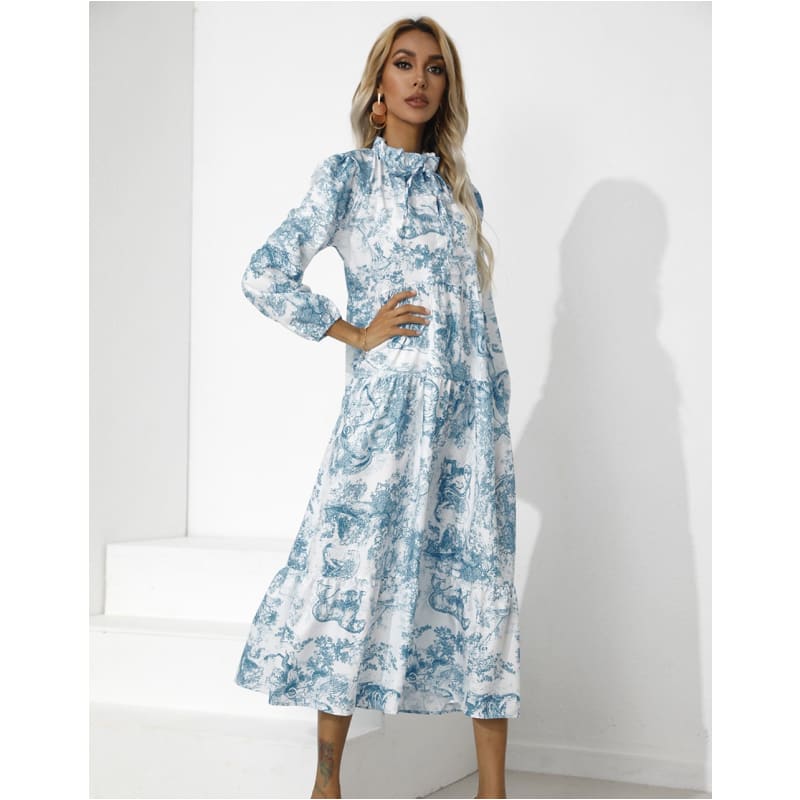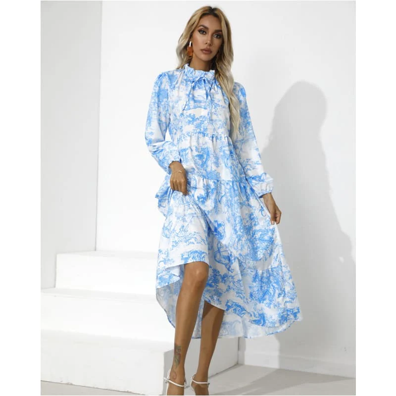 Plusieurs déclinaisons de coloris pour cette robe ample et de bonne longueur. Petit col montant avec nœud de serrage. Manches longues terminées par un élastique. Quelques volants dans la partie basse de la robe. Facile à porter !