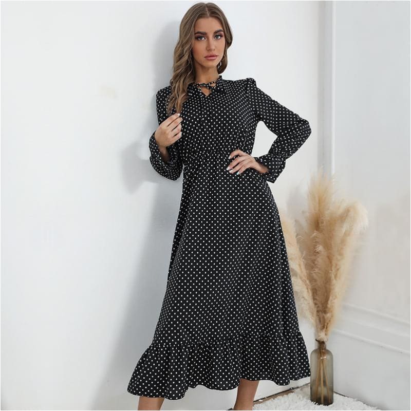 Longue robe noire à pois blanc. Longues manches, volant dans le bas de jupe et des manches. Nœud à l’encolure. Classique et en même temps très habillée.