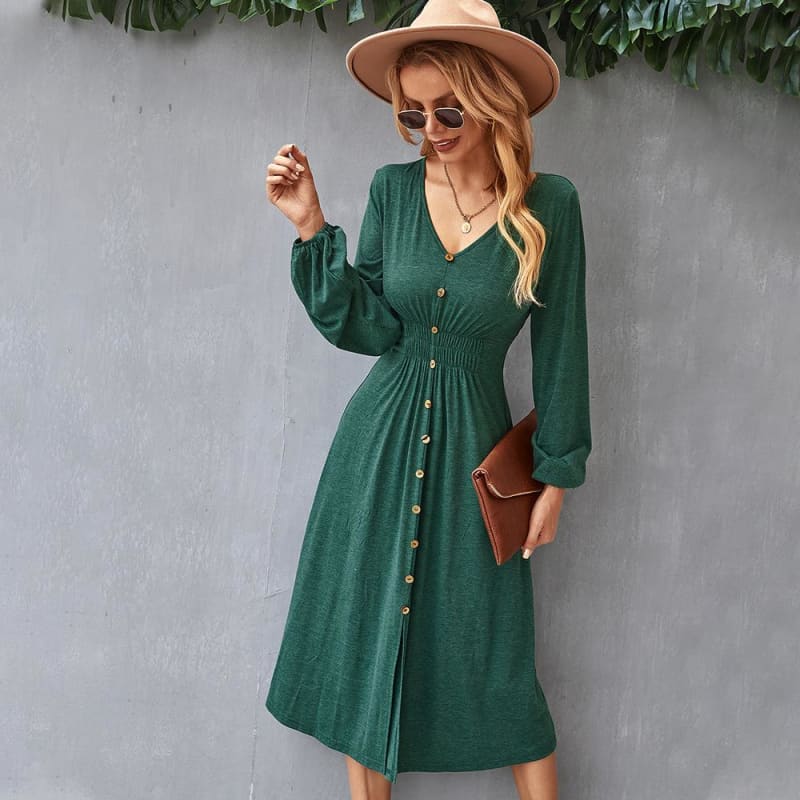 Tissus unis et des coloris vivants pour cette longue robe aux manches longues élastiquées dans le bas. Des fronces à l’avant sous la poitrine et un boutonnage de haut en bas. La maman de la mariée sera sublime !