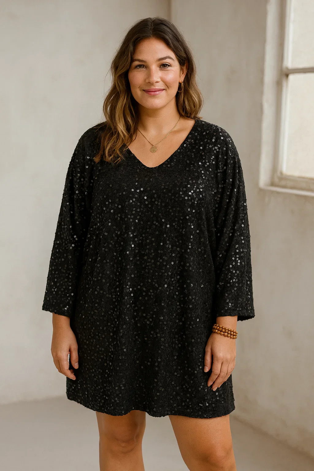 Chère cliente, si vous aimez les pièces lumineuses qui vous mettent en valeur instantanément, cette robe en sequins est faite pour vous. Conçue en taille unique 44 au 50, elle offre une coupe ample et fluide qui vous accompagne avec confort tout en dessinant une silhouette élégante. Son encolure en V apporte une touche féminine tandis que les sequins, parfaitement répartis, créent un scintillement subtil et raffiné.