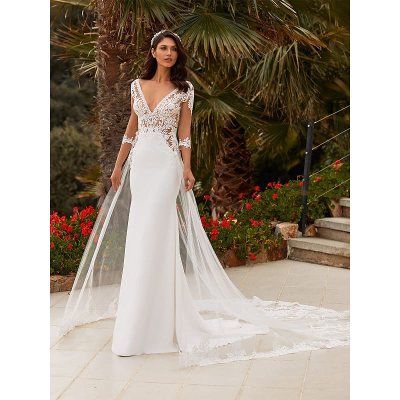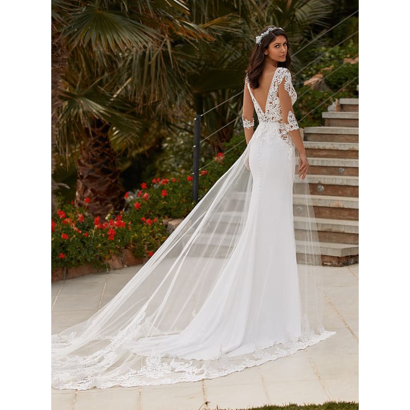 Sublime robe de mariée moulante, avec voile de dentelle qui part de la taille et se termine en traine. Joli bustier ajourer. Petites manches courtes en dentelles. Quelle beauté !