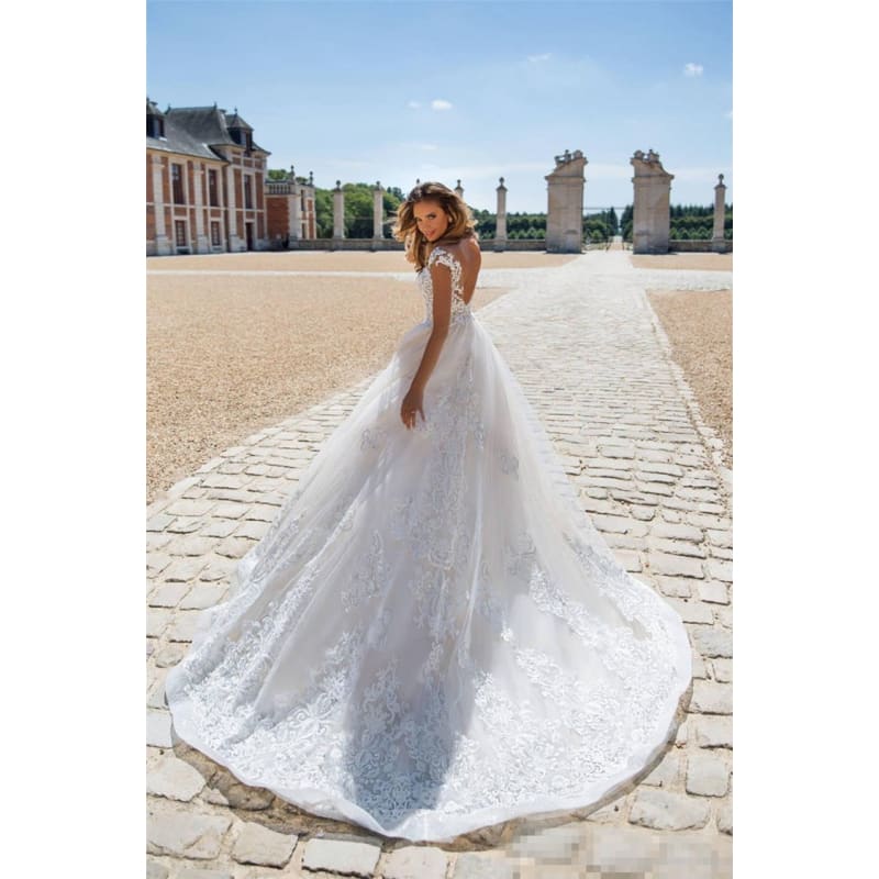 Avec son corsage en dentelle, son décolleté et son dos nu, sa jupe ample couverte de dentelle, cette longue robe de mariée à tout pour plaire !