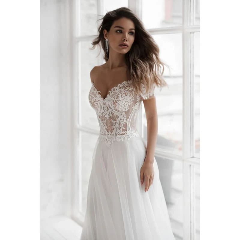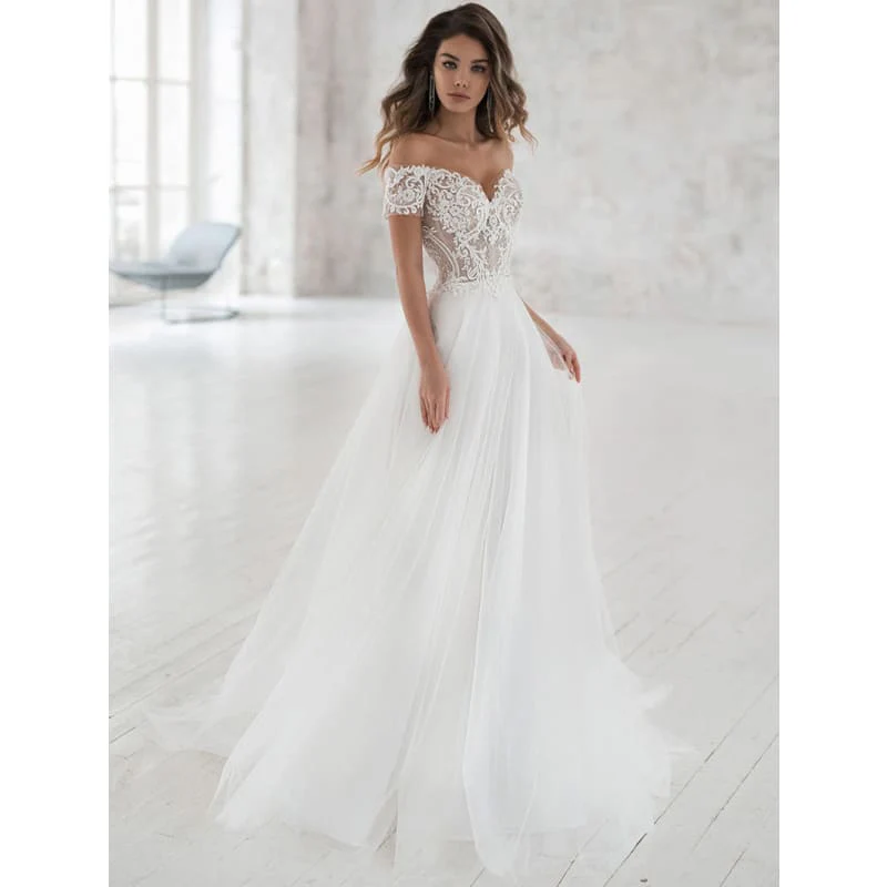 Robe longue et évasée à manches courtes. Joli décolleté plongeant et épaules dénudées. Bustier en broderie près du corps. Une robe de conte de fées !