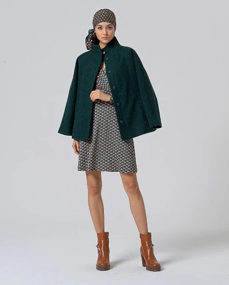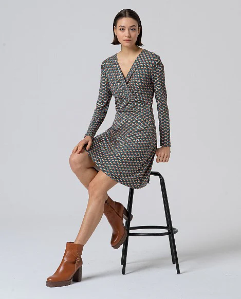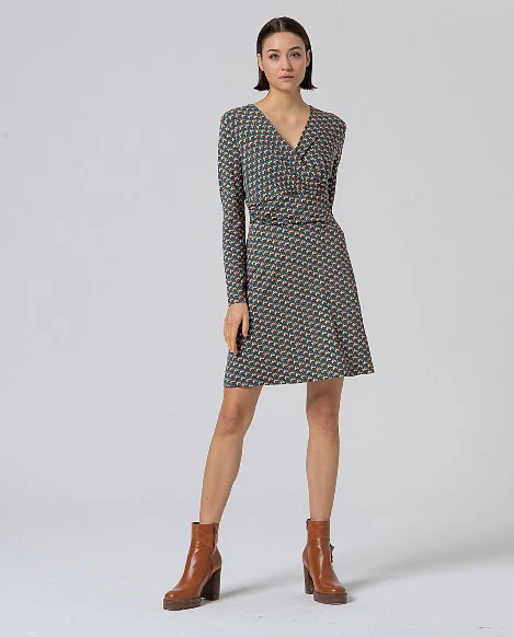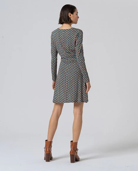 Dotée d’un col en V croisé et de manches longues ajustées, cette robe met en valeur la silhouette avec sa coupe légèrement évasée. Son imprimé graphique coloré, signature de Surkana, lui apporte une touche bohème chic et moderne.