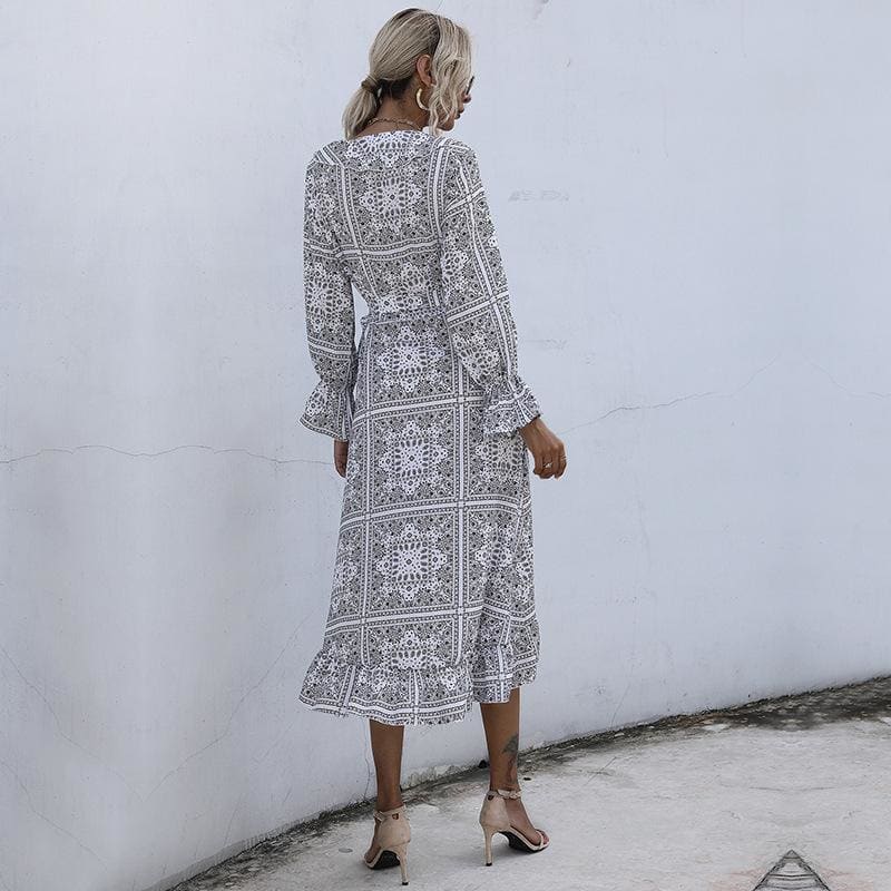 Style carreaux imprimés pour cette robe longue à manches longues terminées par un volant en guise de poignet. Cette robe portefeuille nouée sur le côté et qui se croise devant avec un volant sur toute la bordure de robe en passant par la jolie encolure en V est splendide dans les deux coloris.