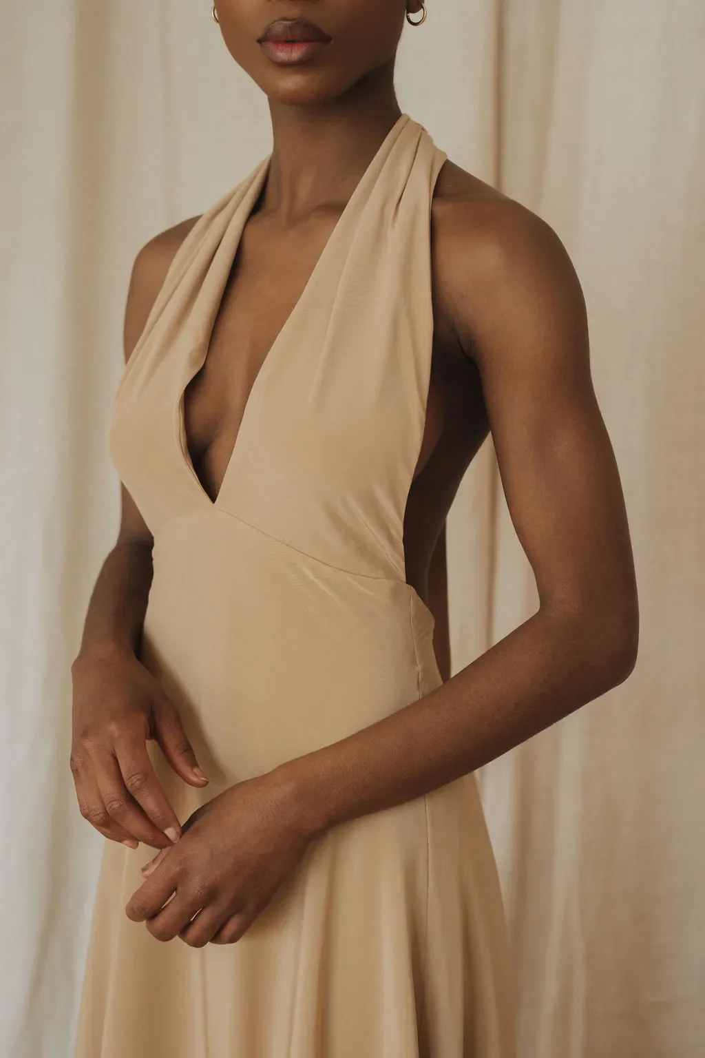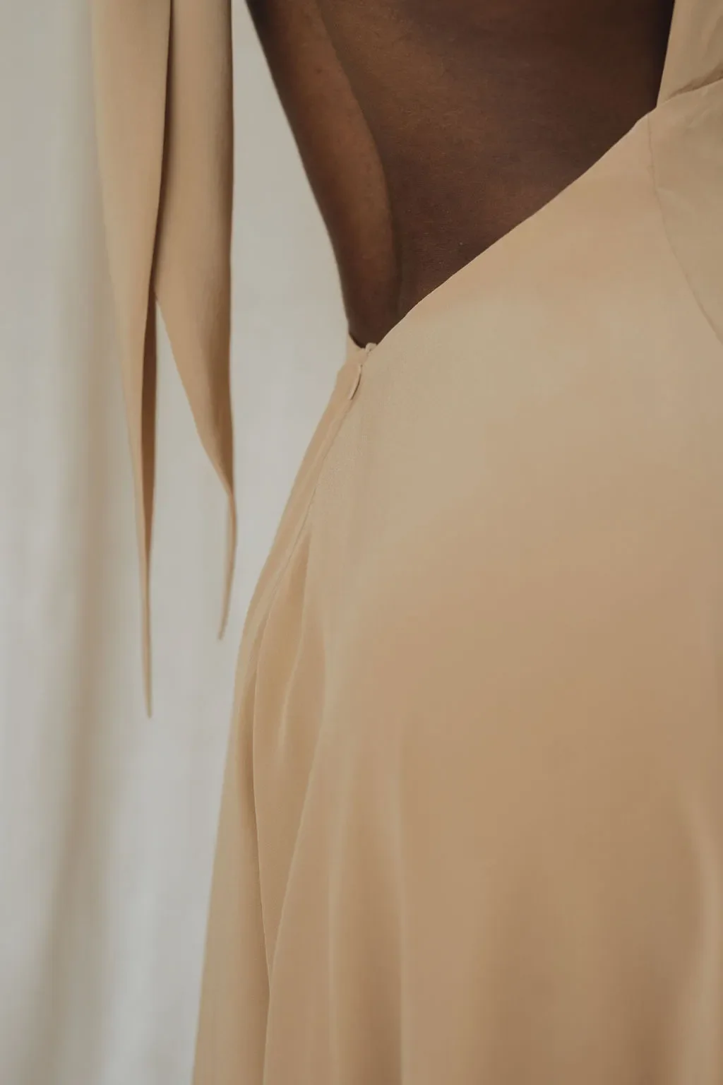 Notre robe Idylle, dans une couleur sublime, entre un beige et un marron clair, longue avec un dos ouvert 100% crêpe de soie.