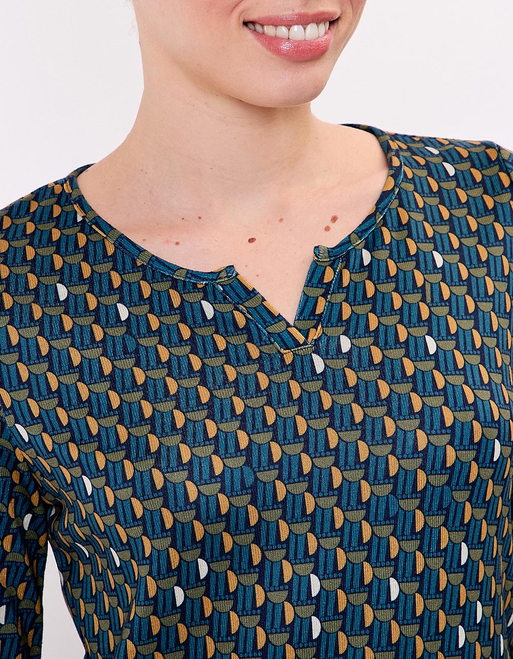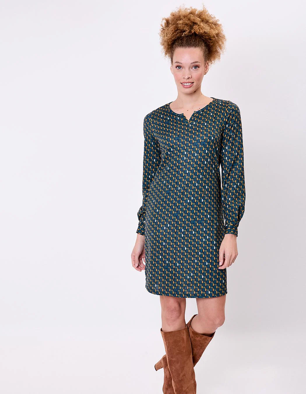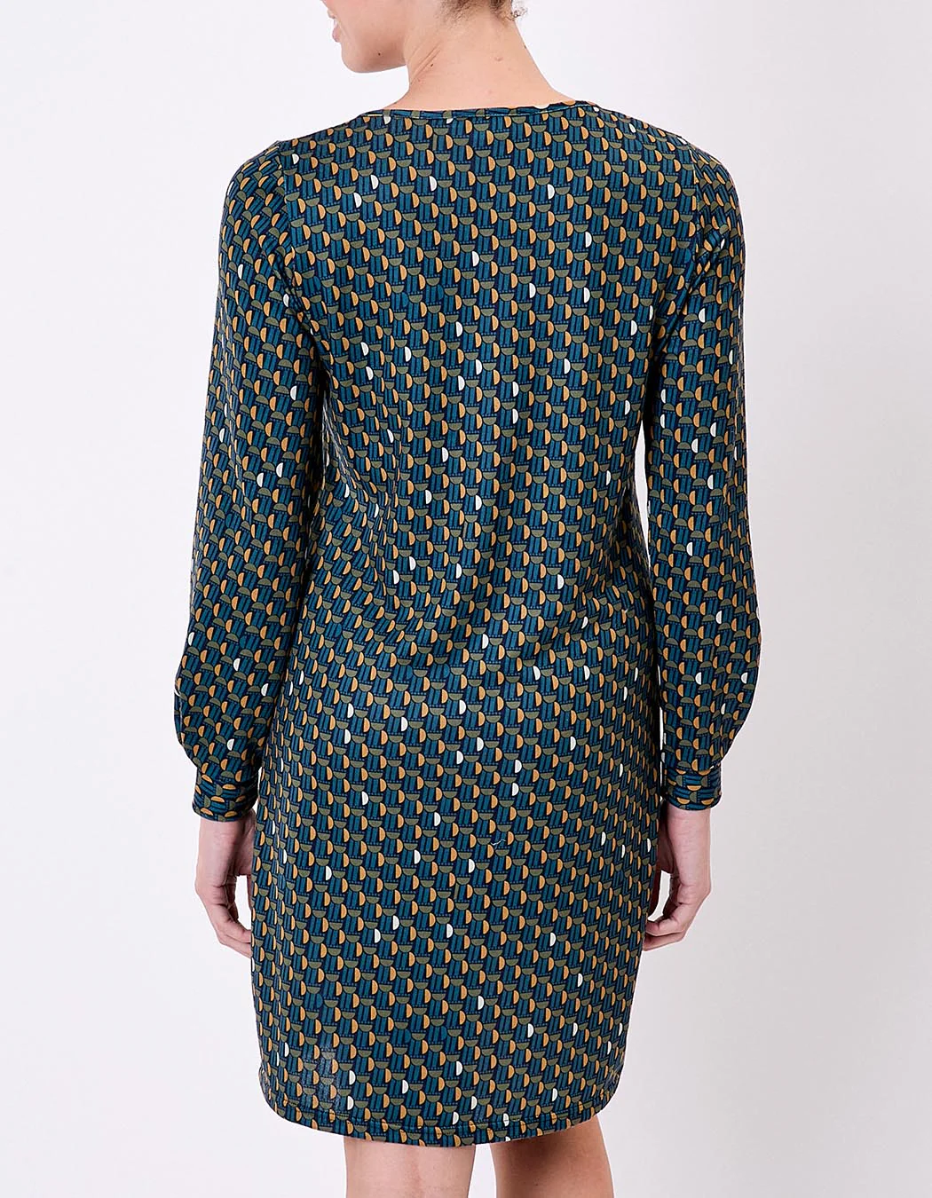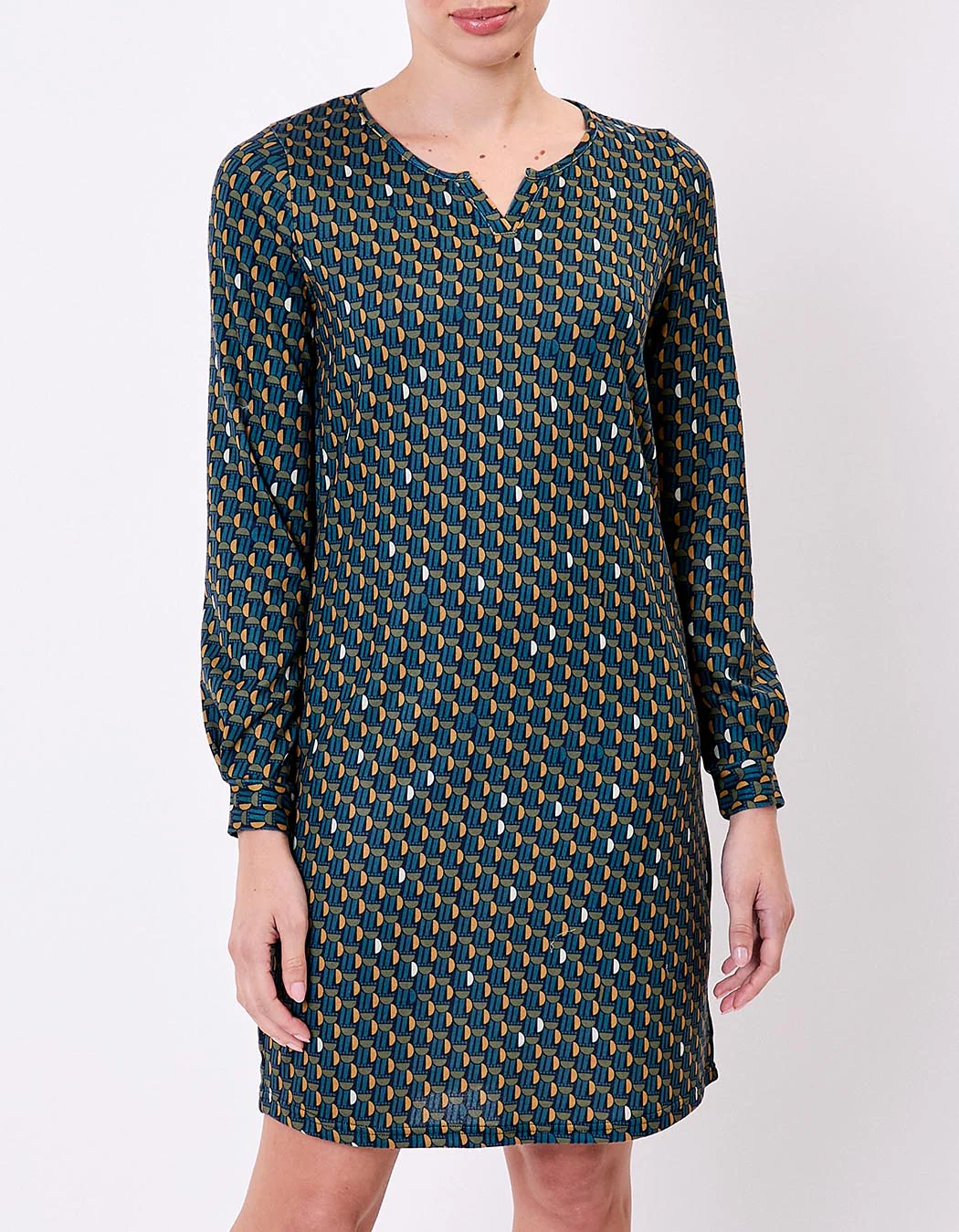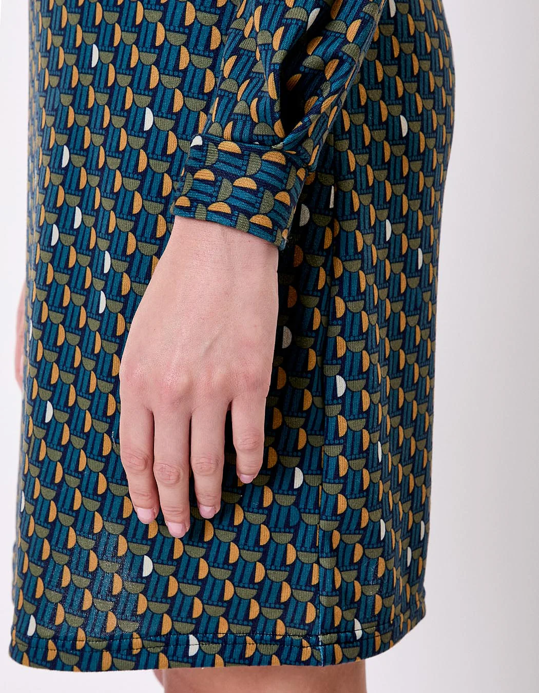 Détails du produit : Robe imprimée coupe droite – Encolure tunisienne – Manches longues avec pli creux – Matière : 96 % polyester, 4 % élasthanne – Imprimé Octopus Marine – Taille 36 à 44 – La mannequin mesure 1,70 m et porte une taille 36.
