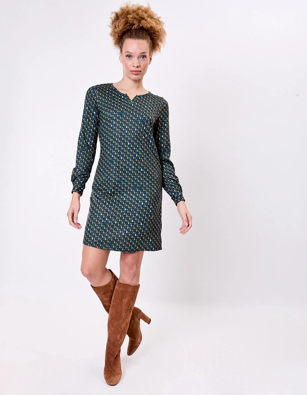 Cette robe imprimée se distingue par sa coupe droite et sa matière fluide qui épouse délicatement la silhouette. Confectionnée dans une maille douce (96 % polyester, 4 % élasthanne), elle assure un confort optimal et une aisance parfaite tout au long de la journée. Son encolure tunisienne apporte une note moderne et féminine, tandis que ses manches longues terminées par un pli creux et un poignet lui confèrent un style raffiné.
