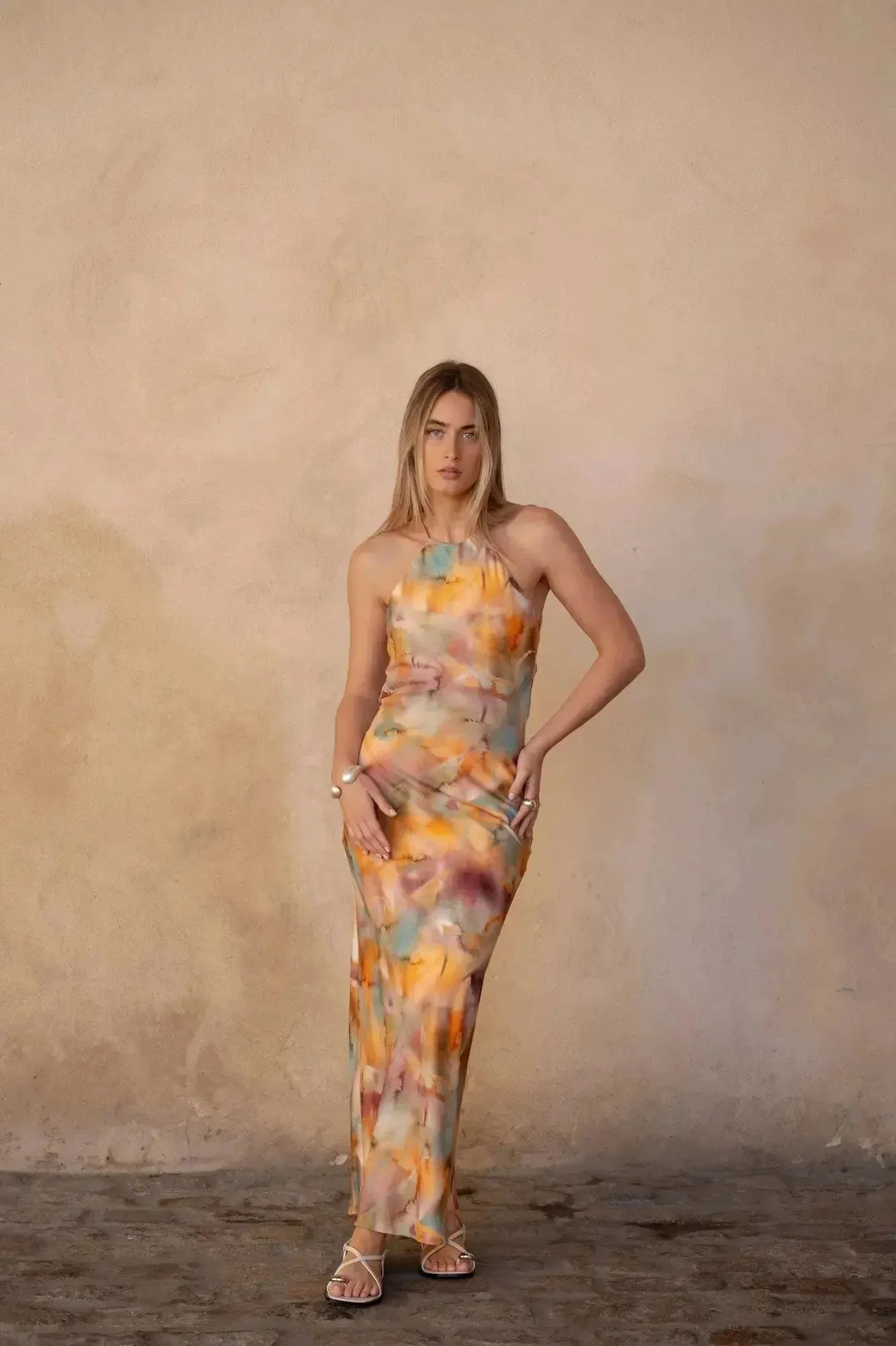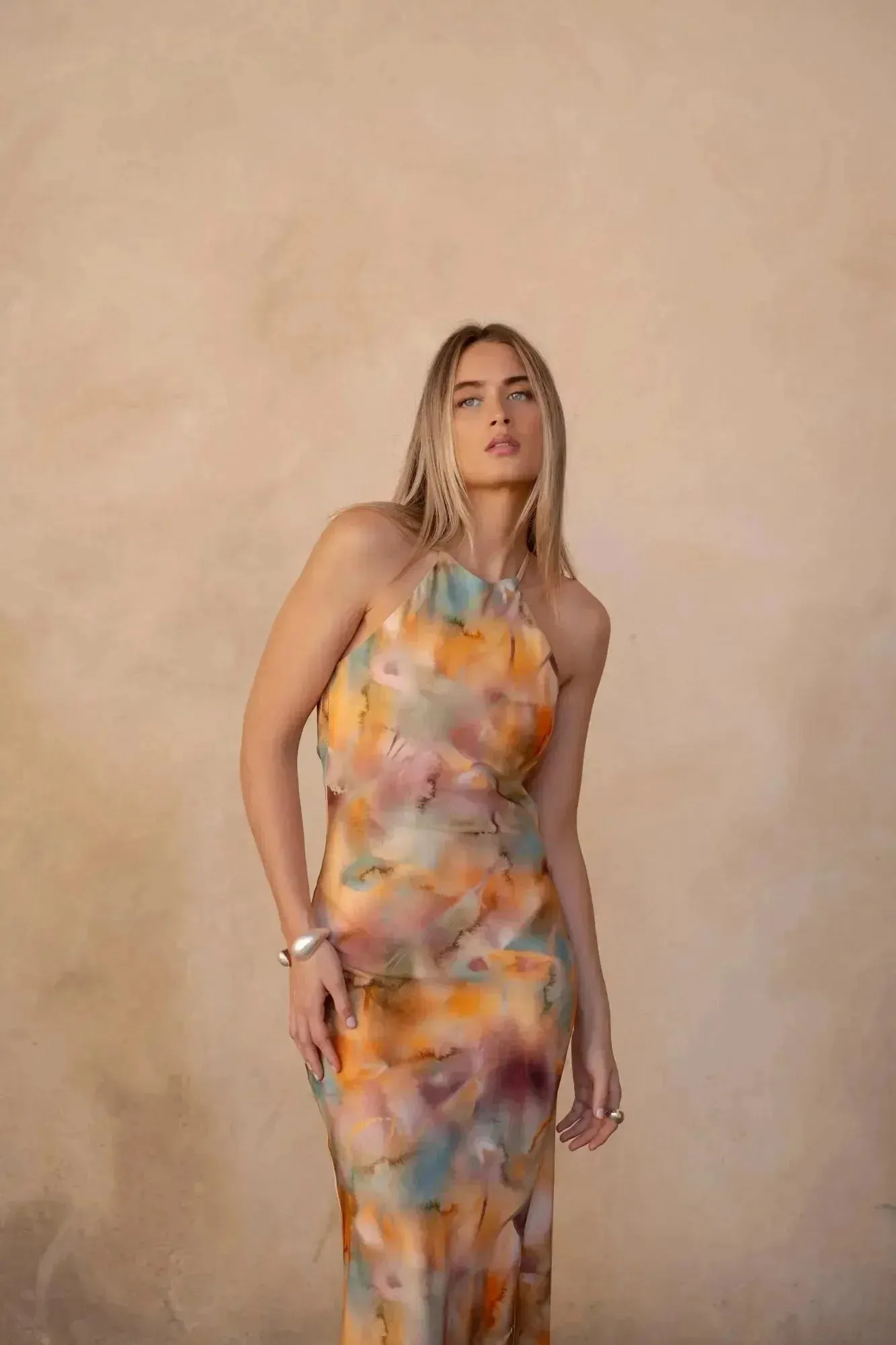 Découvrez notre robe satin longue dos nu imprimée aquarelle – Élégance fluide et colorée