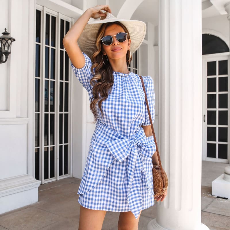 Une minirobe imprimée en carreaux. Col rond, manches en ballon et à mi-longueur du bras, un bouton discret derrière la nuque, la taille est ceinturée avec un nœud.