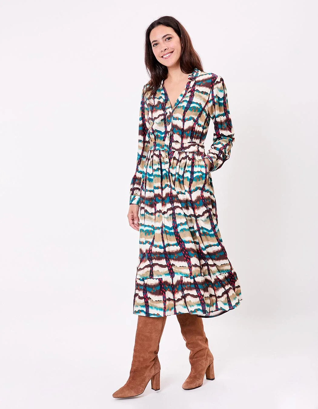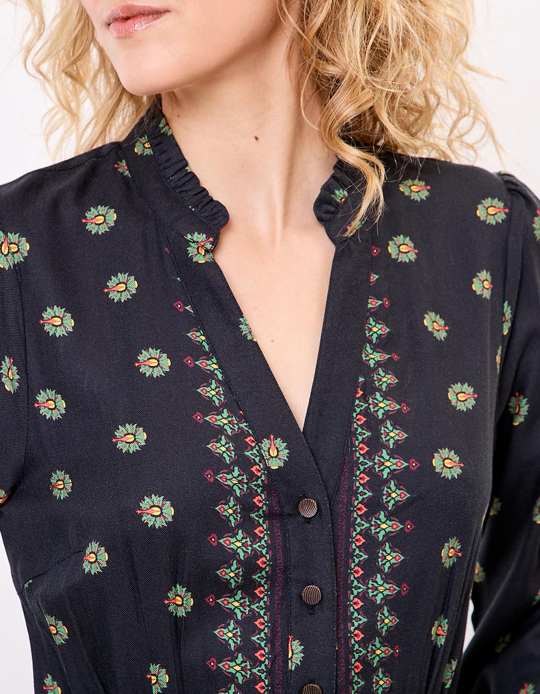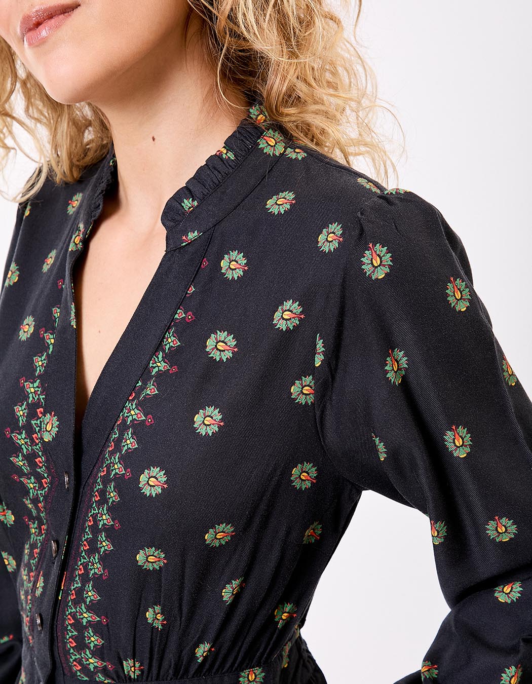 Parfaite pour la mi-saison comme pour l’hiver, cette robe s’associe aussi bien à des bottines en cuir qu’à des sandales pour un look plus léger. Son imprimé Asha délicat s’intègre harmonieusement dans un vestiaire bohème chic et intemporel.
