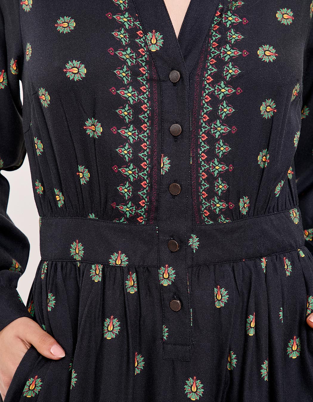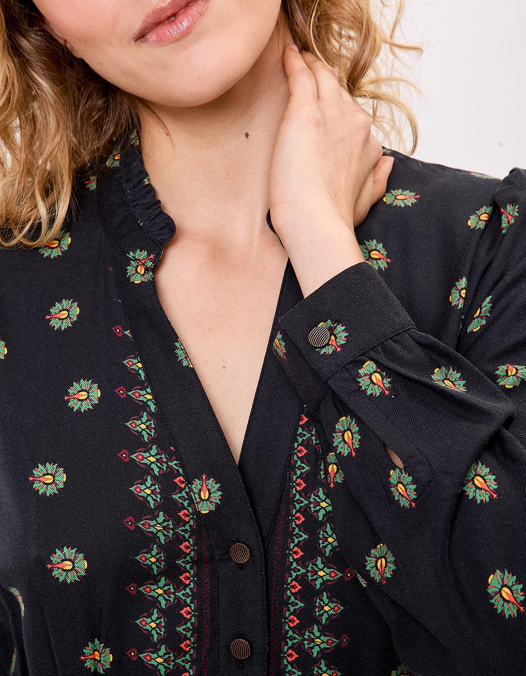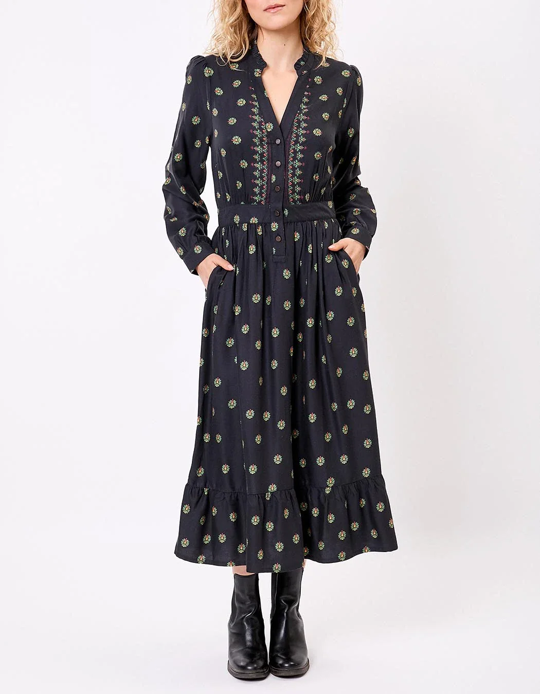 Parfaite pour la mi-saison comme pour l’hiver, cette robe s’associe aussi bien à des bottines en cuir qu’à des sandales pour un look plus léger. Son imprimé Asha délicat s’intègre harmonieusement dans un vestiaire bohème chic et intemporel.