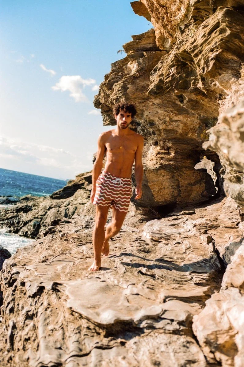 Maillot de bain homme 100% recyclé à partir de 10 bouteilles en plastique. Andreas mesure 1m79 et porte le maillot en M.Si vous hésitez entre deux tailles, optez pour celle du dessus.