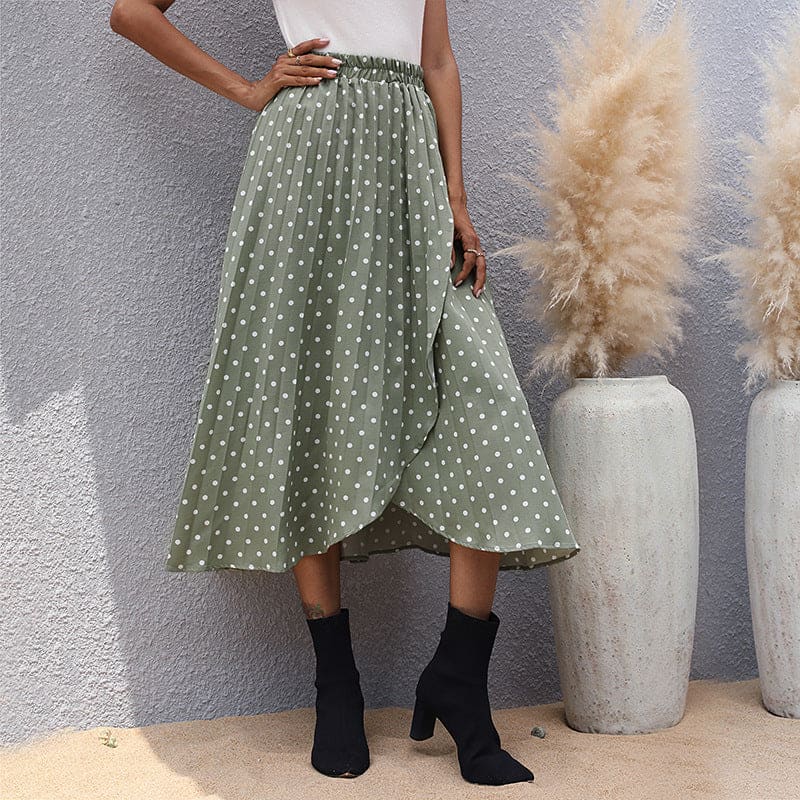 Longue jupe verte à pois blanc avec taille froncée, élastiquée et coupe asymétrique sur le devant. Du charme et du style ! Vous apprécierez son confort !