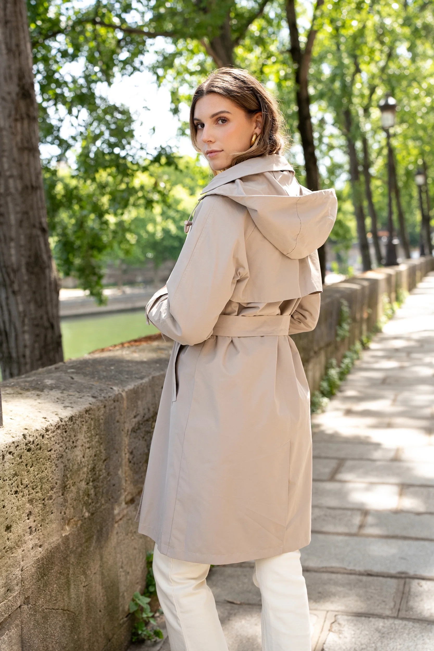 Ce trench se distingue par sa coupe croisée classique et sa capuche amovible, qui permet d’alterner entre un style urbain pratique et une allure plus sophistiquée. Confectionné dans un tissu technique imperméable et respirant, il protège efficacement des intempéries tout en restant léger et confortable. Sa ceinture à nouer souligne la taille et met en valeur la silhouette avec élégance.