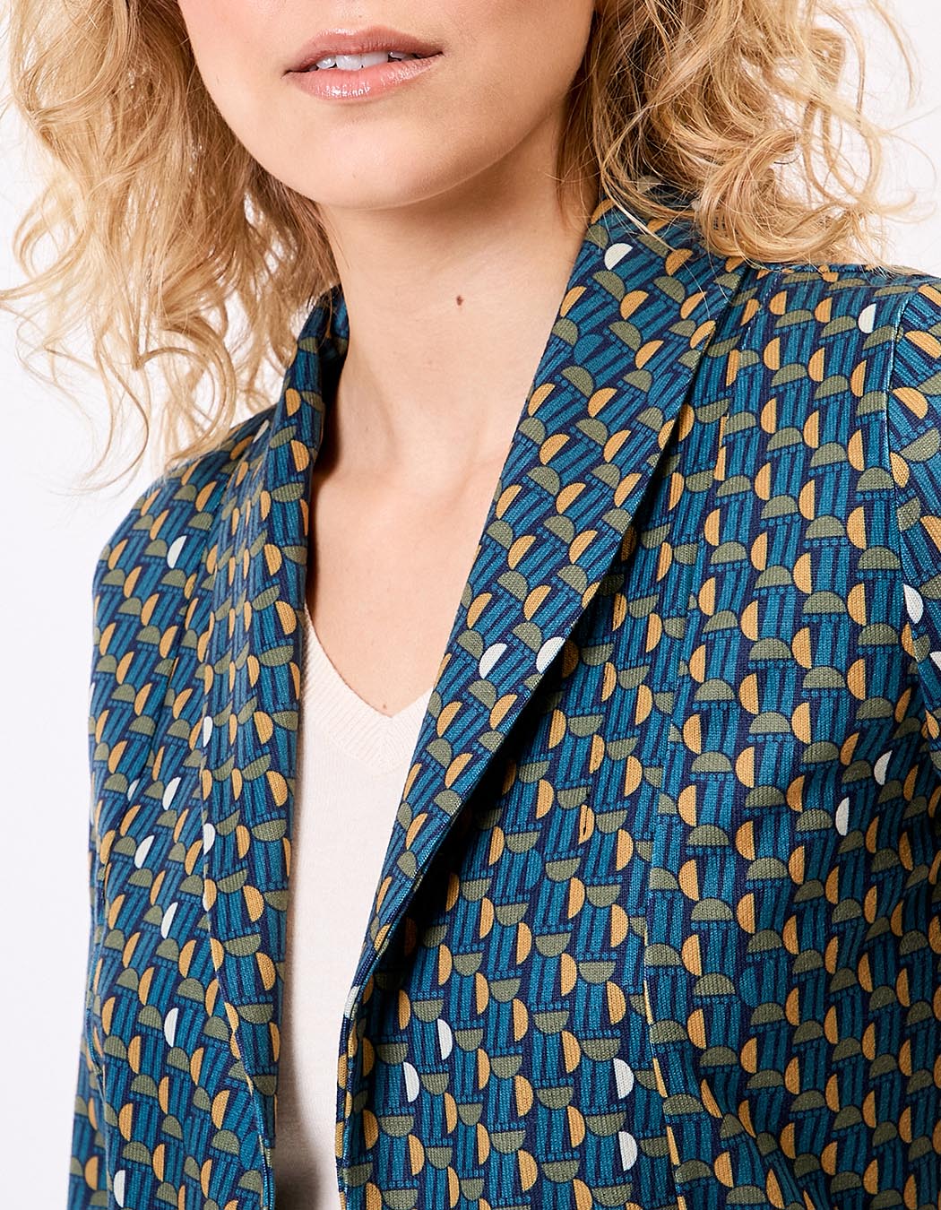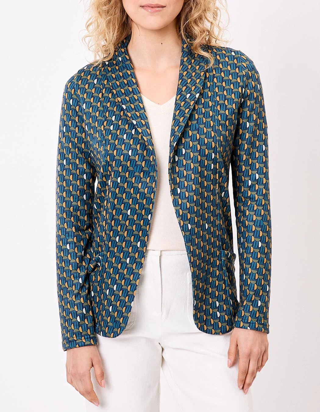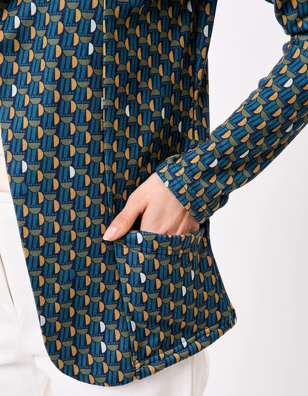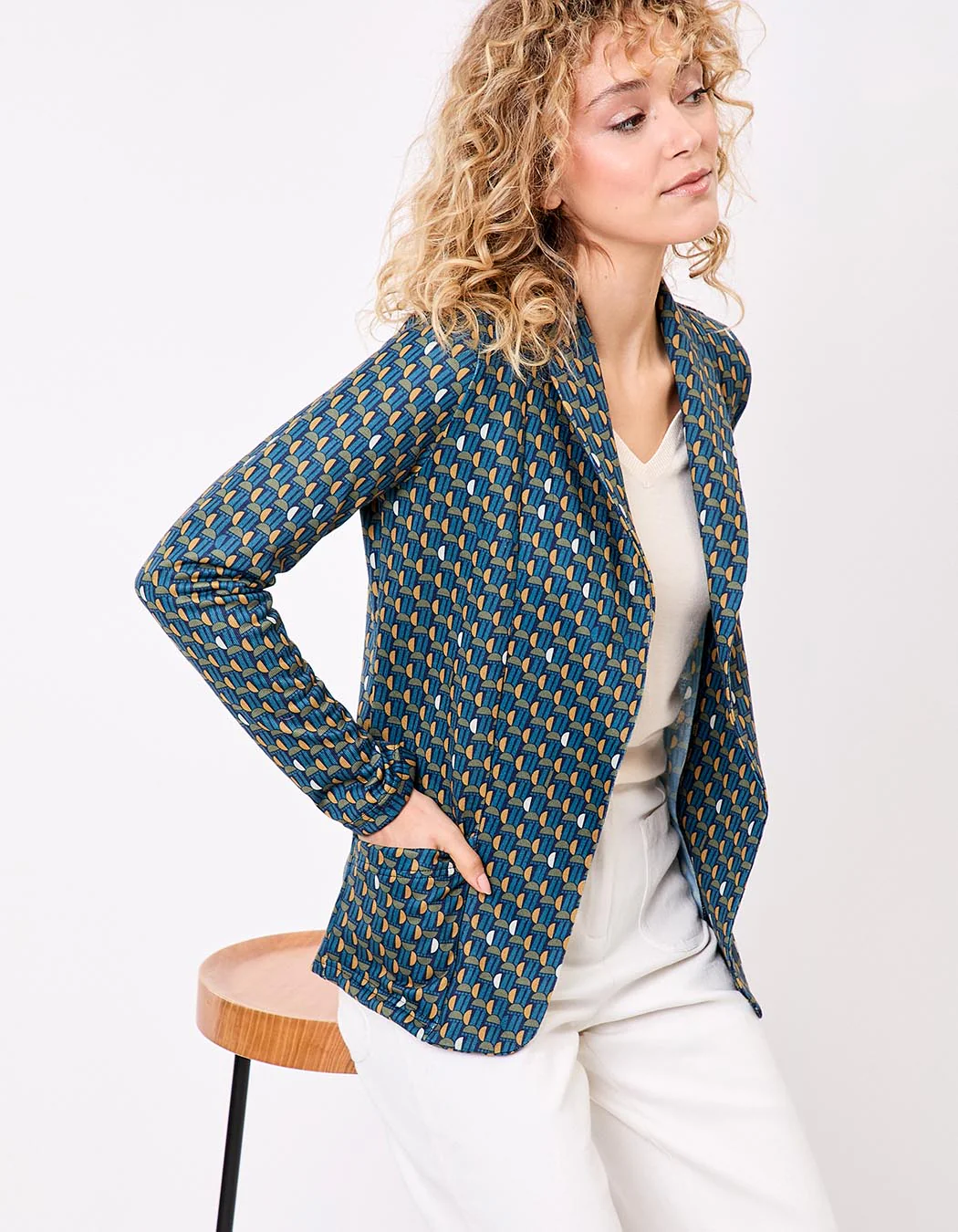 Cette veste souple en maille jersey est une pièce élégante et confortable qui complète parfaitement un vestiaire bohème chic. Conçue en 96 % polyester et 4 % élasthanne, elle offre une matière fluide et extensible, agréable à porter toute la journée. Son imprimé Octopus Marine, graphique et coloré, apporte une touche originale et moderne.