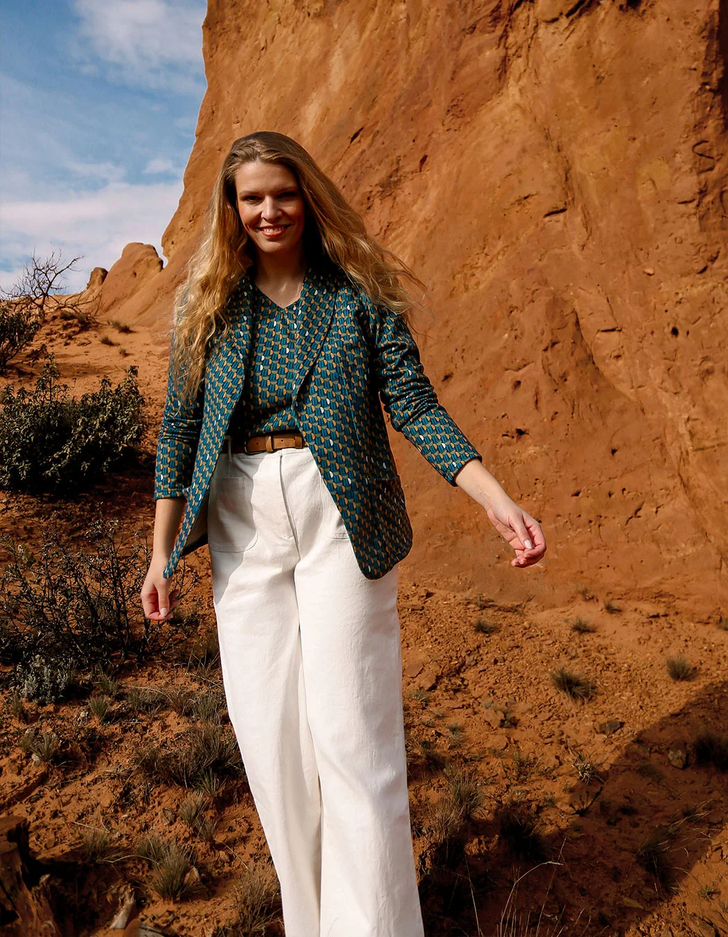 Veste souple imprimée Octopus Marine Cette veste souple en maille jersey est une pièce élégante et confortable qui complète parfaitement un vestiaire bohème chic. Conçue en 96 % polyester et 4 % élasthanne, elle offre une matière fluide et extensible, agréable à porter toute la journée. Son imprimé Octopus Marine, graphique et coloré, apporte une […]