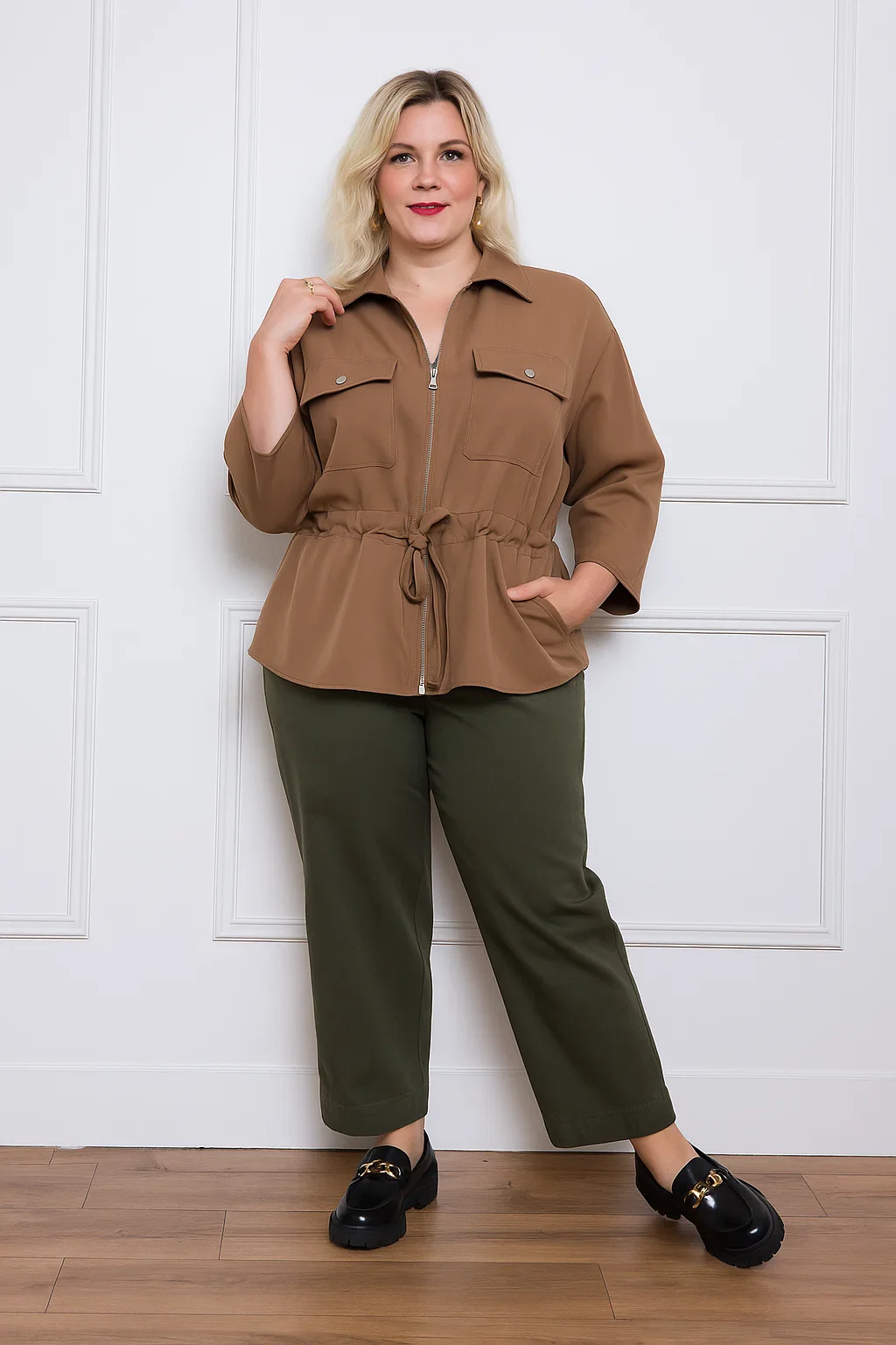 Polyvalente, cette veste peut être portée ouverte sur un tee-shirt ou une blouse pour un look casual, ou fermée et ceinturée pour structurer la silhouette et mettre en valeur la taille. Sa teinte camel intemporelle se marie aisément avec un pantalon de la collection pantalons grandes tailles ou avec une jupe fluide pour une allure féminine.